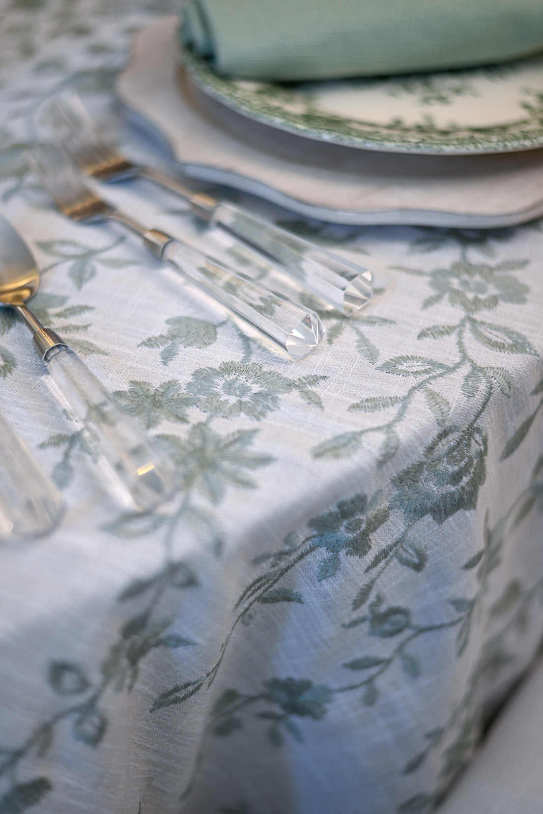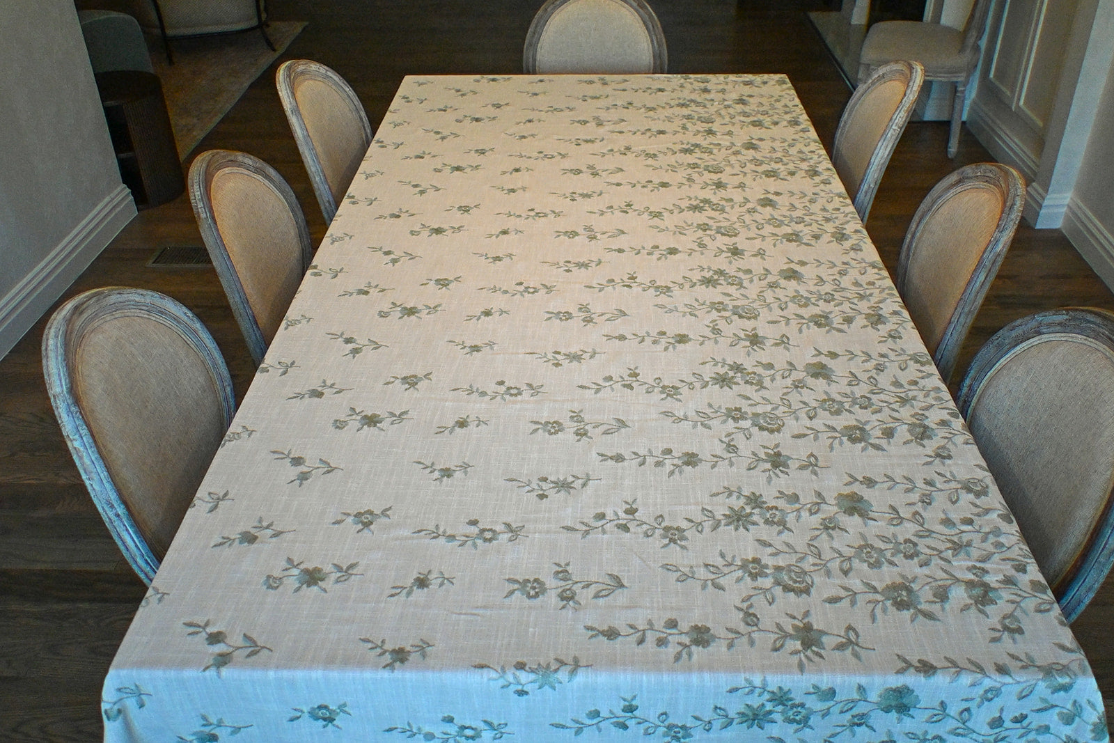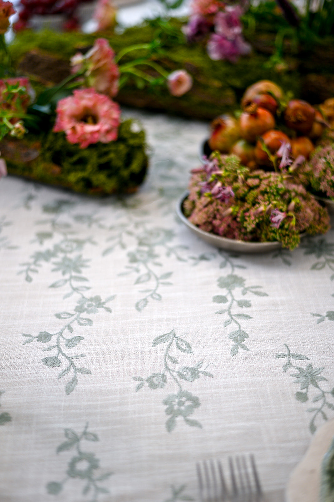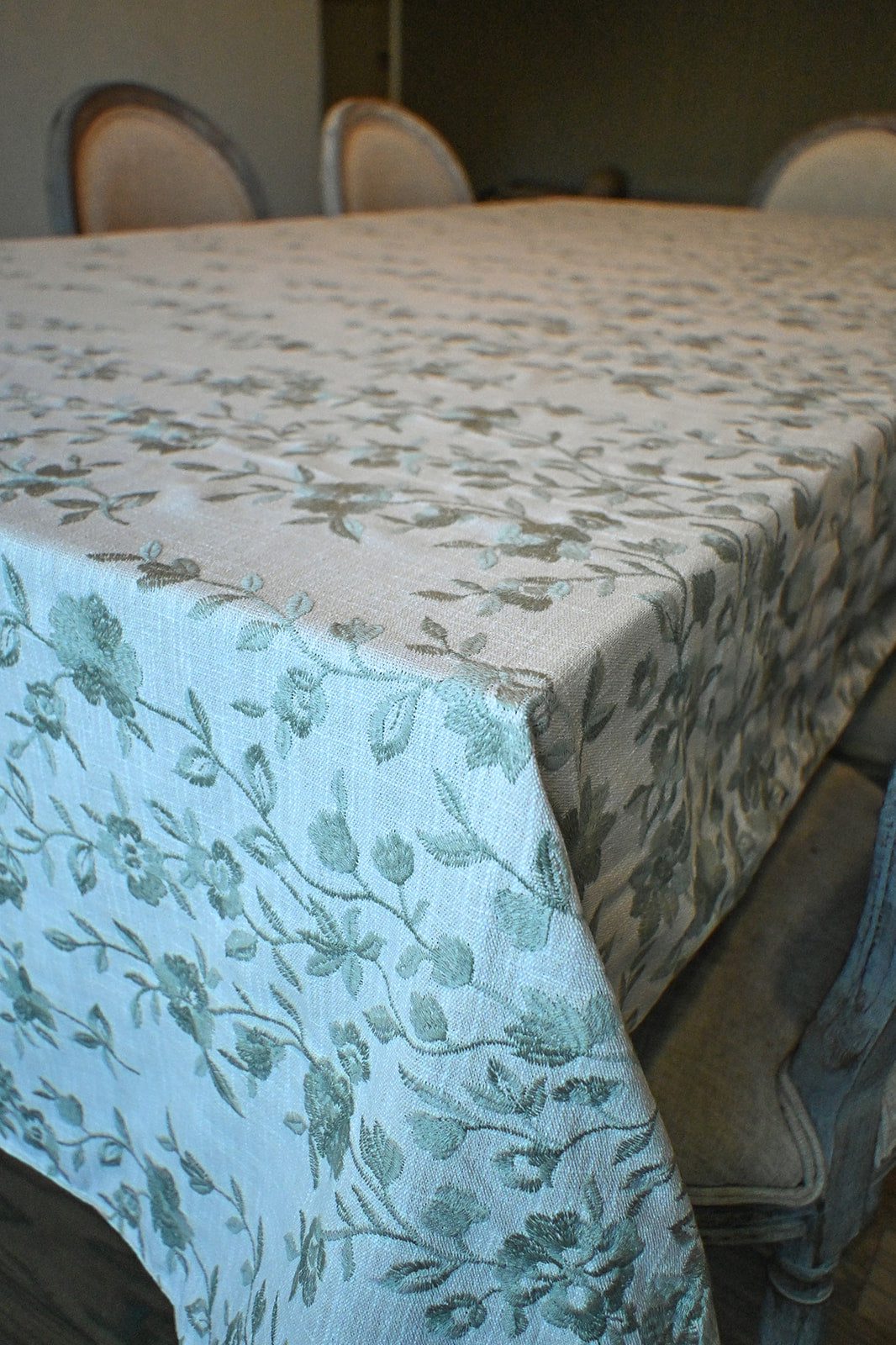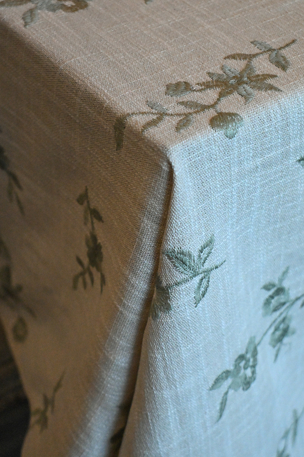 This tablecloth is a soft cream linen fabric embroidered with sage green vines and blossoms in an asymmetrical pattern, giving it a refined yet organic feel. The design evokes the charm of a secret garden, bringing a touch of nature’s elegance to the table.