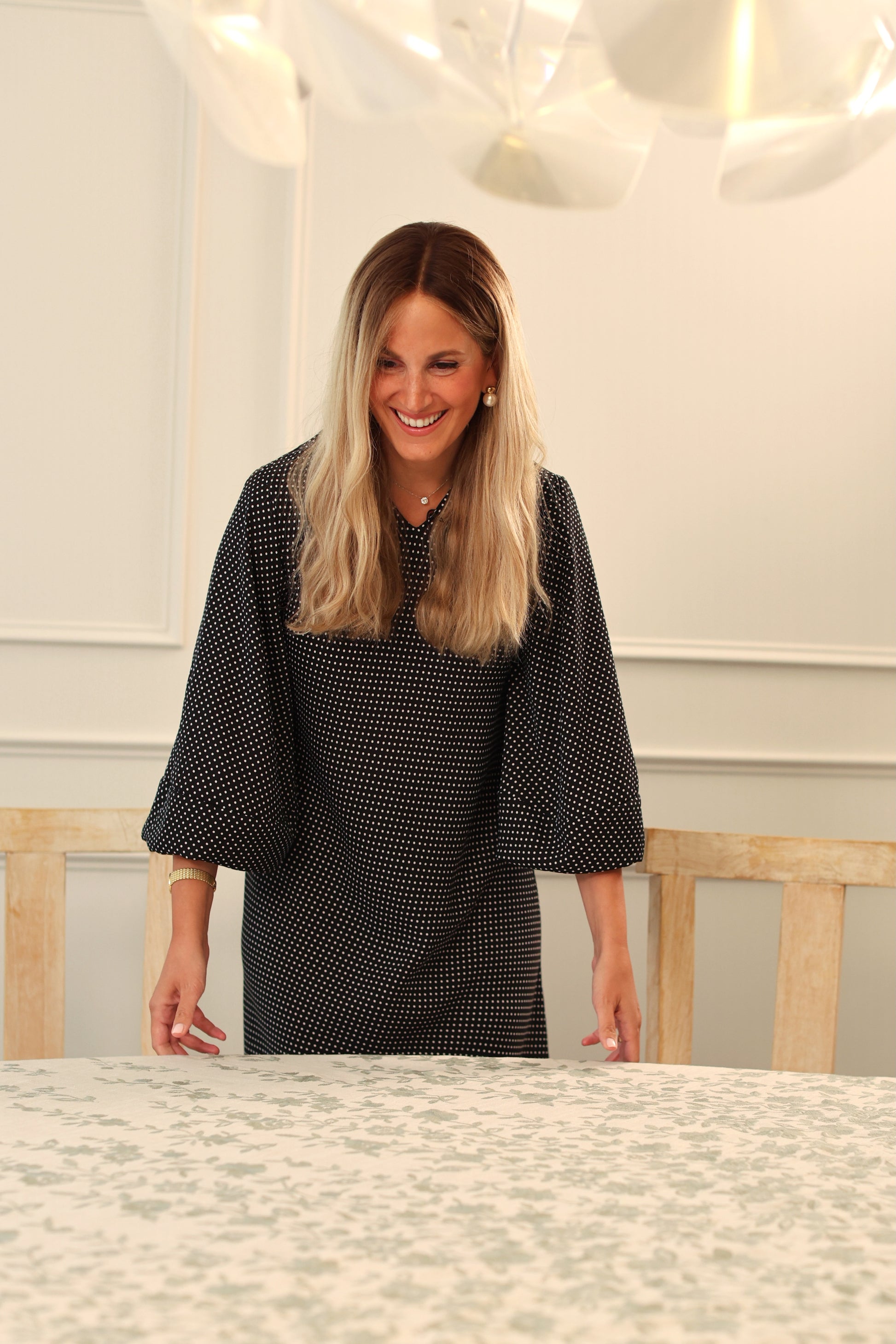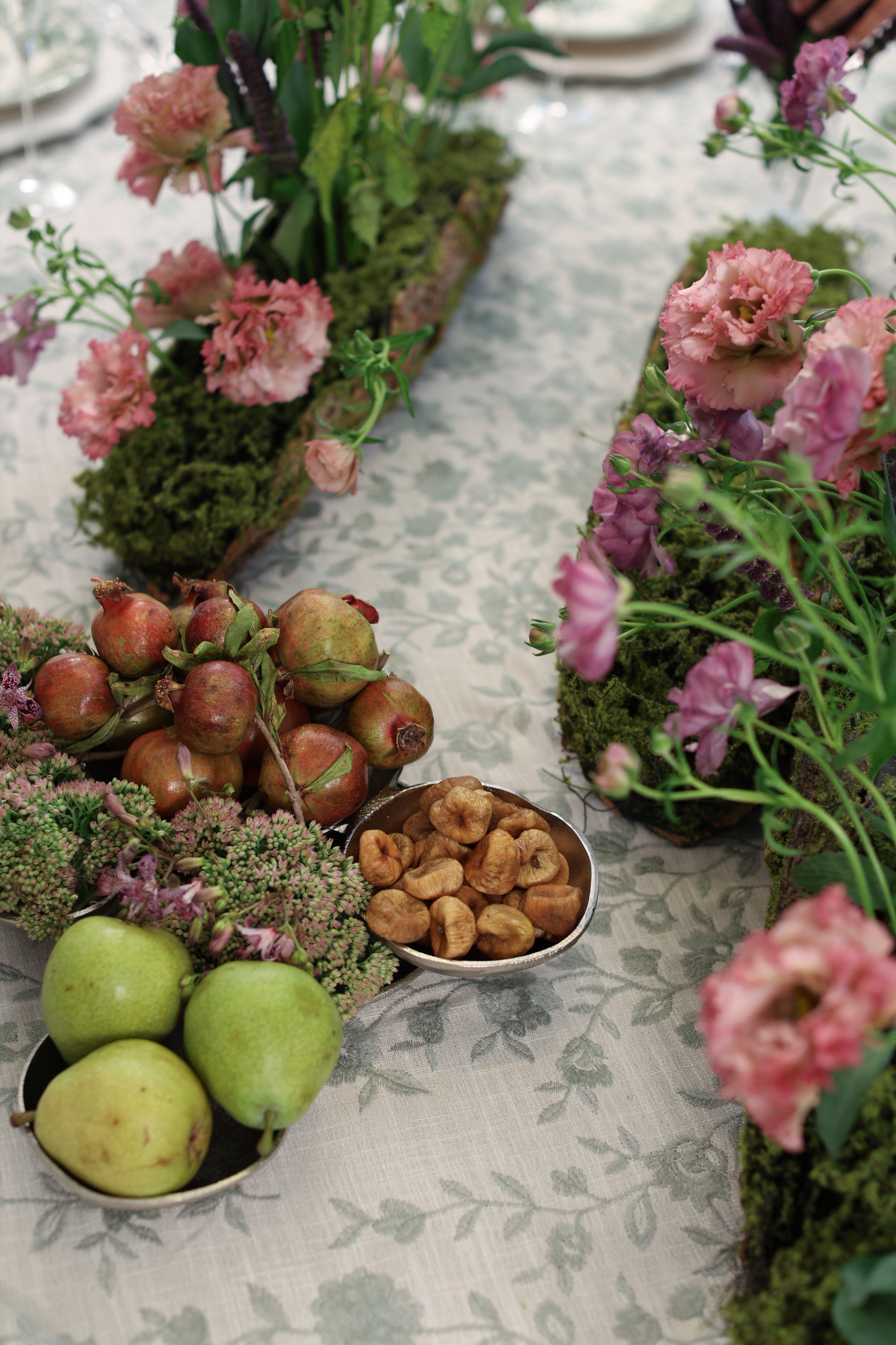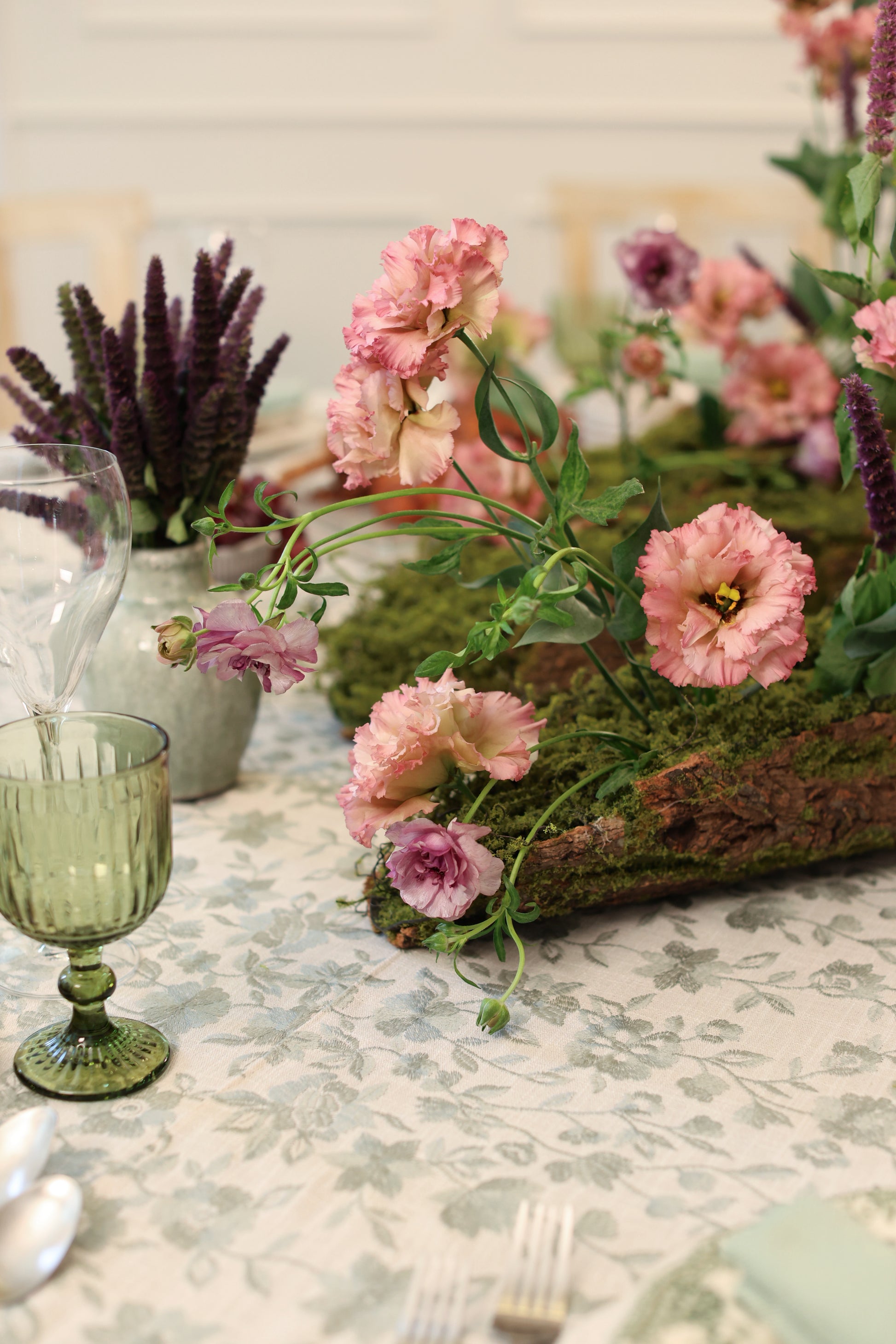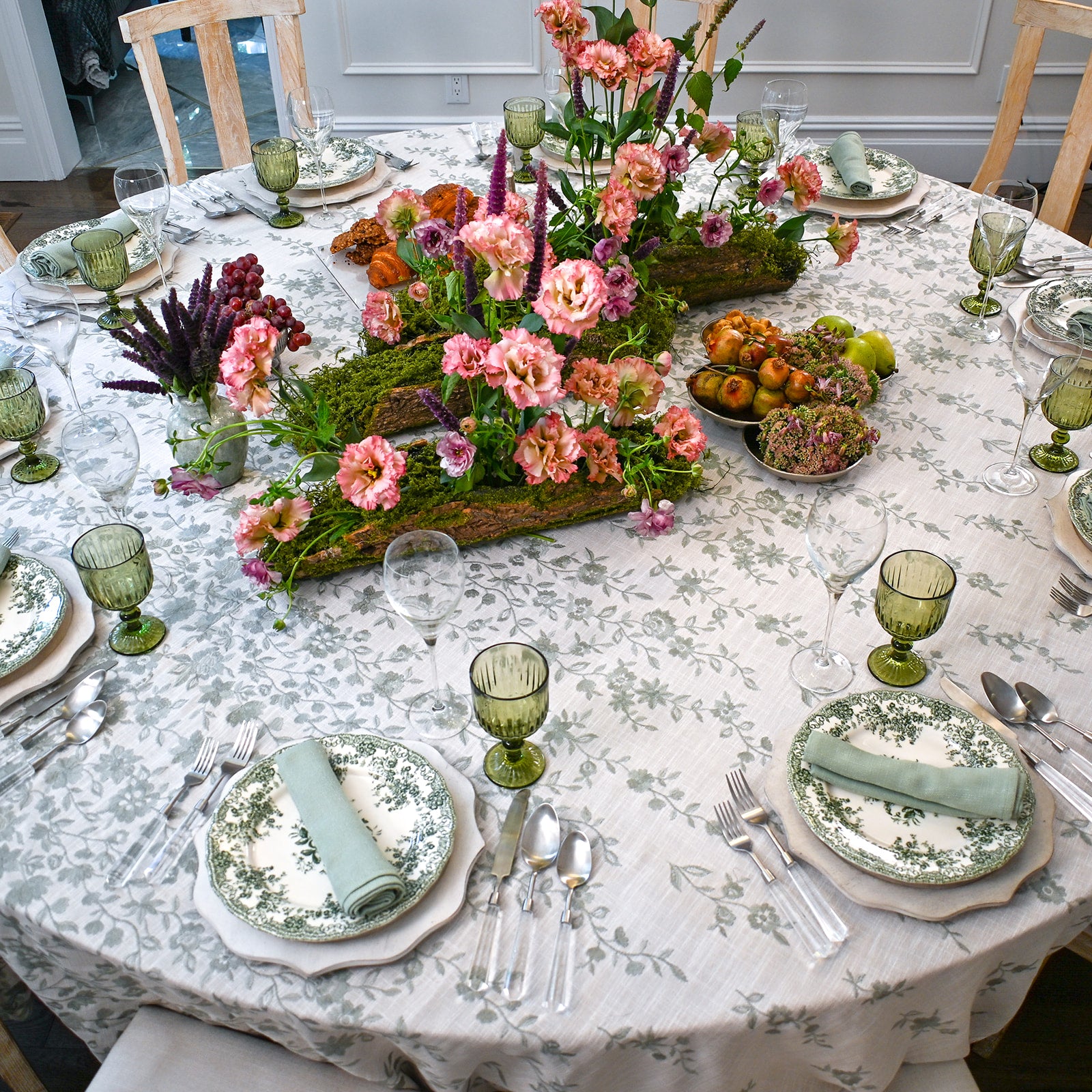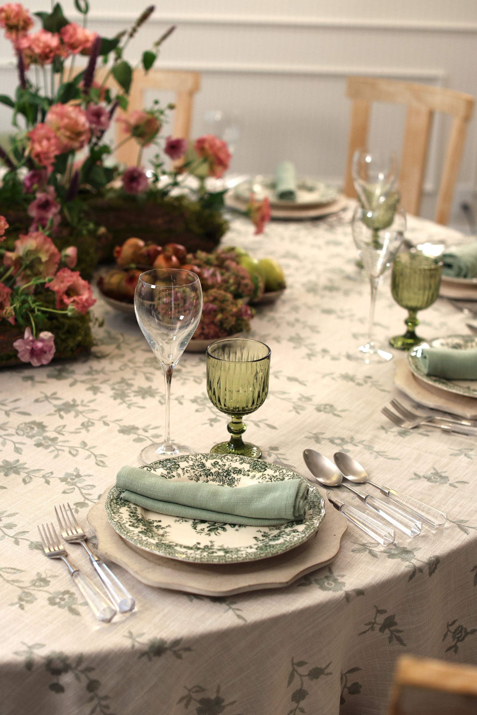 This tablecloth is a soft cream linen fabric embroidered with sage green vines and blossoms in an asymmetrical pattern, giving it a refined yet organic feel. The design evokes the charm of a secret garden, bringing a touch of nature’s elegance to the table.