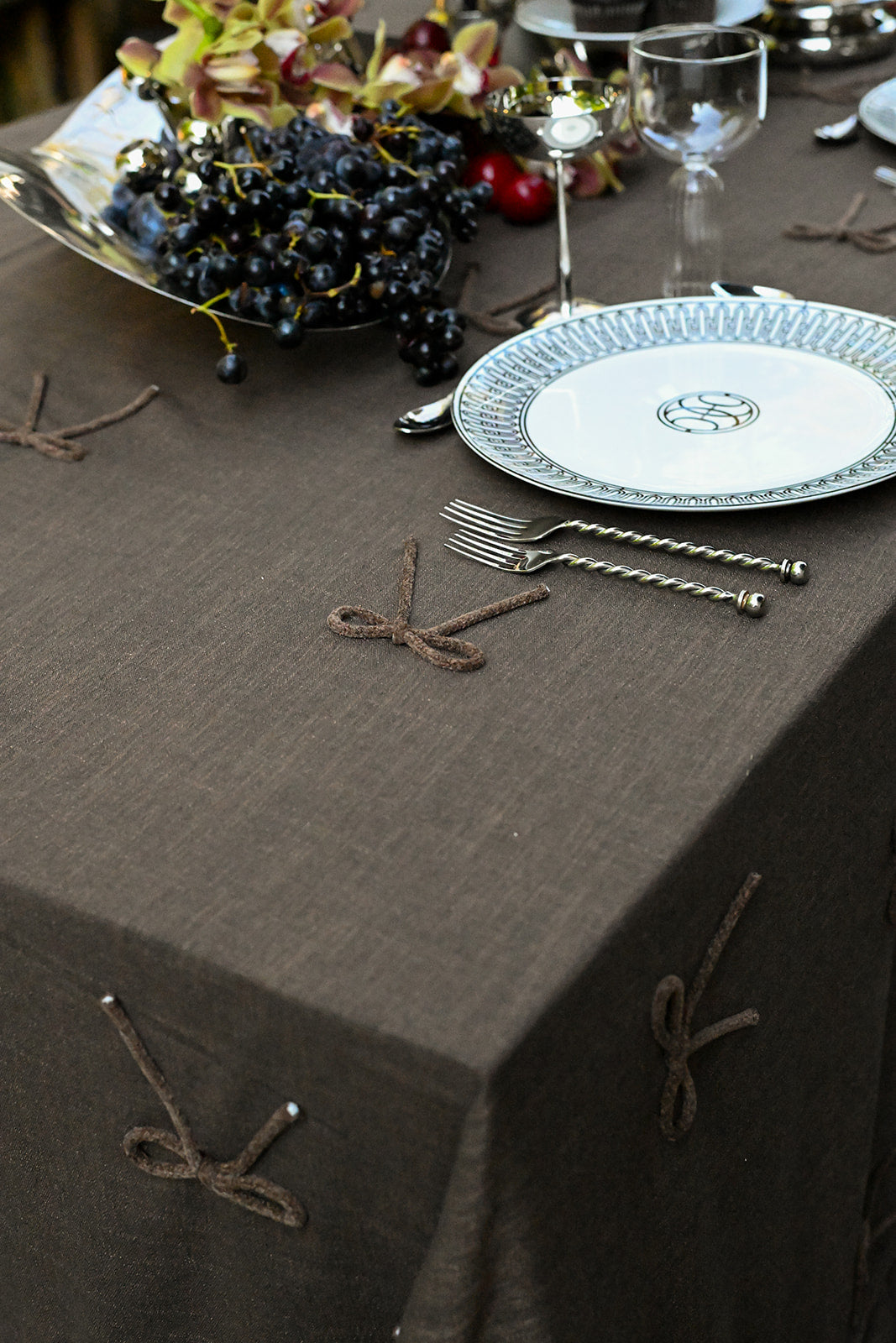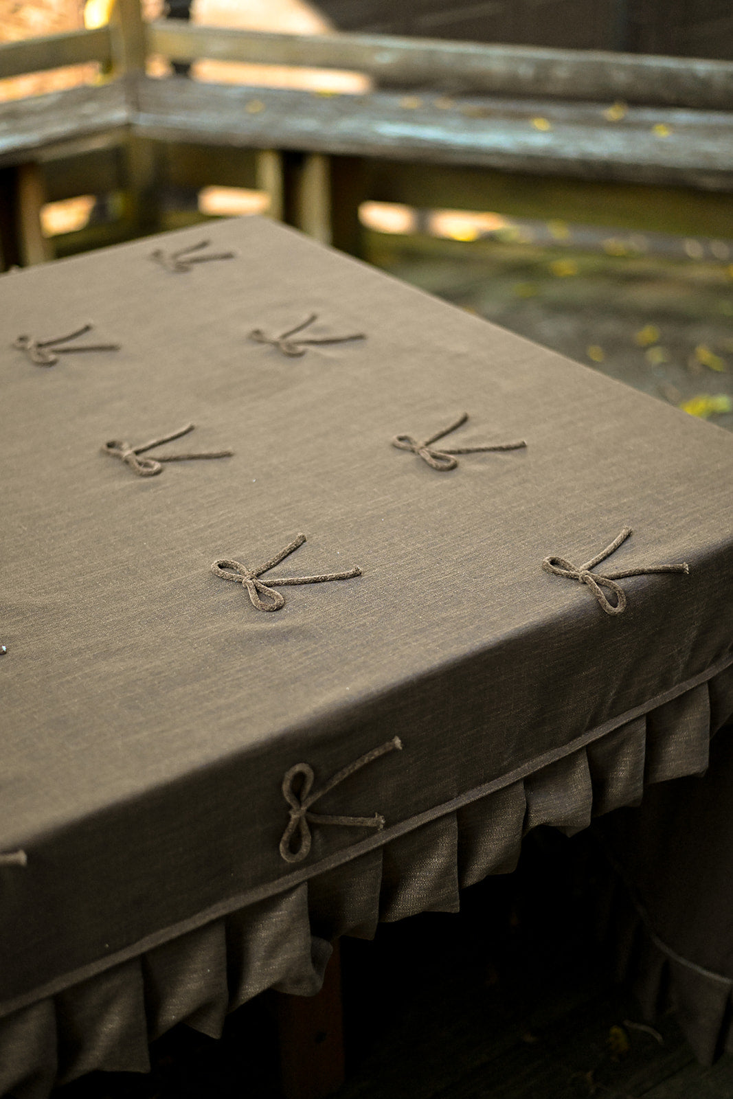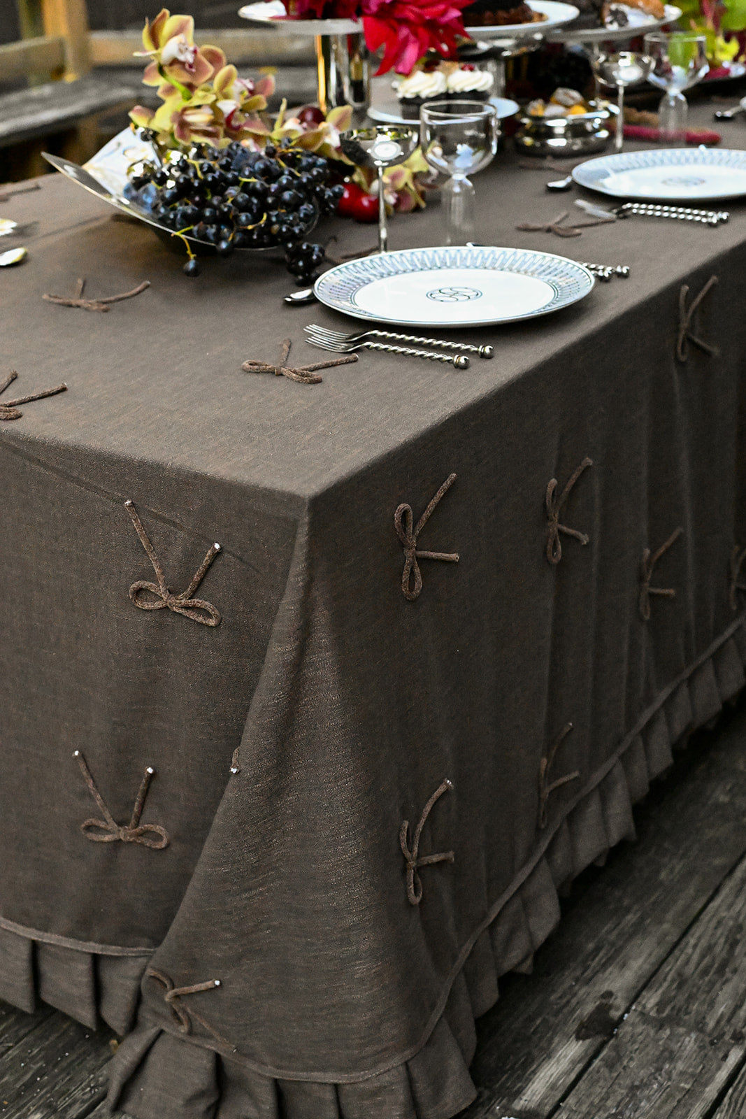 This Brown linen tablecloth is beautifully detailed with delicate bow accents scattered across the fabric, adding a touch of charm and sweetness. The design is finished with a pleated bottom edge, giving it an elegant, tailored look. Its combination of natural linen texture with sophisticated detailing makes it both timeless and unique.
