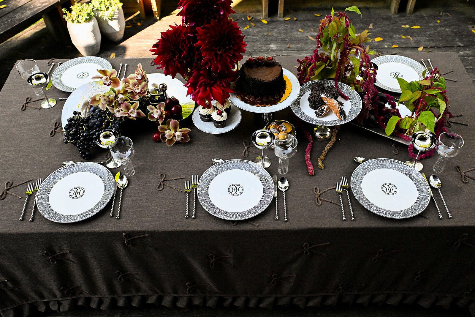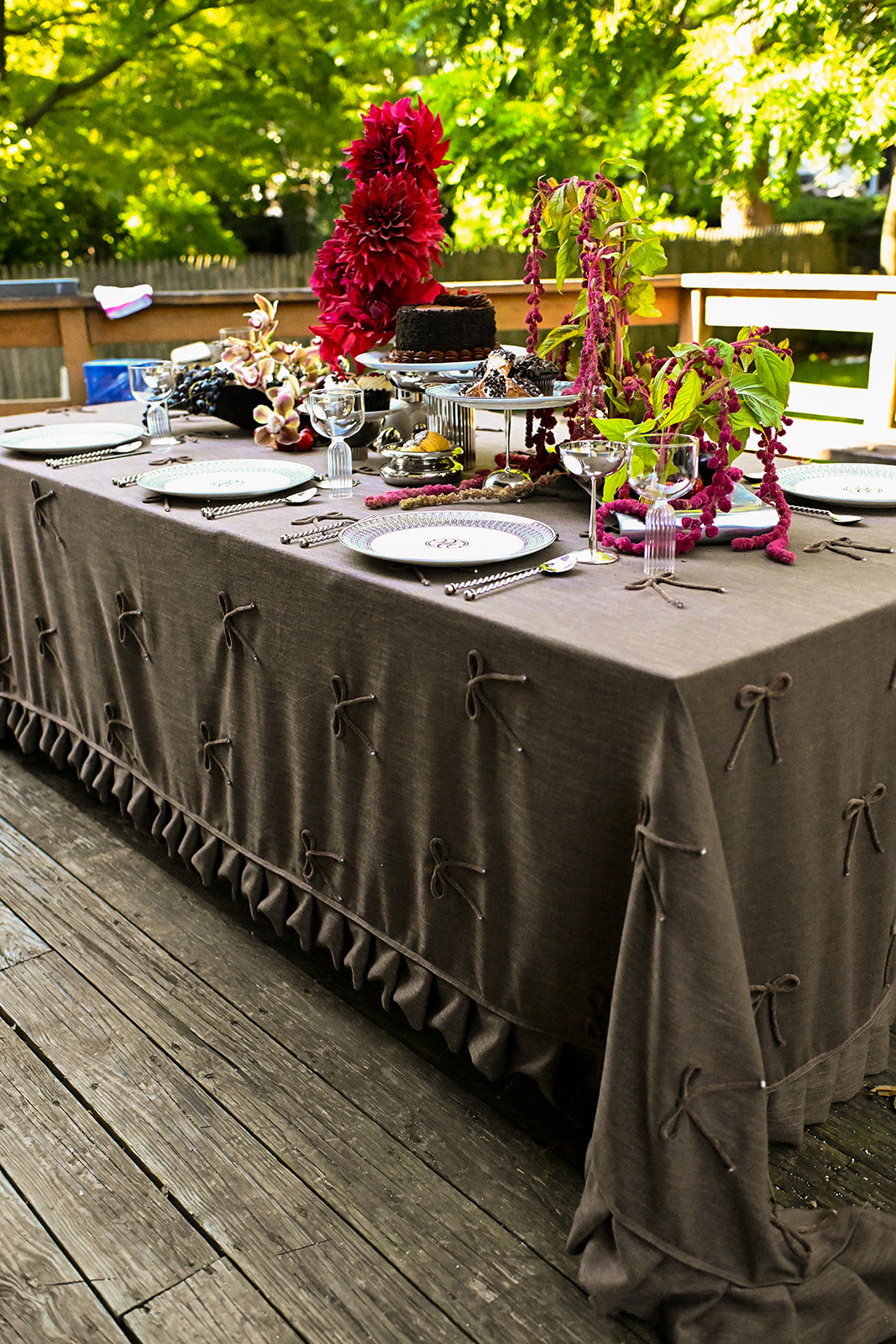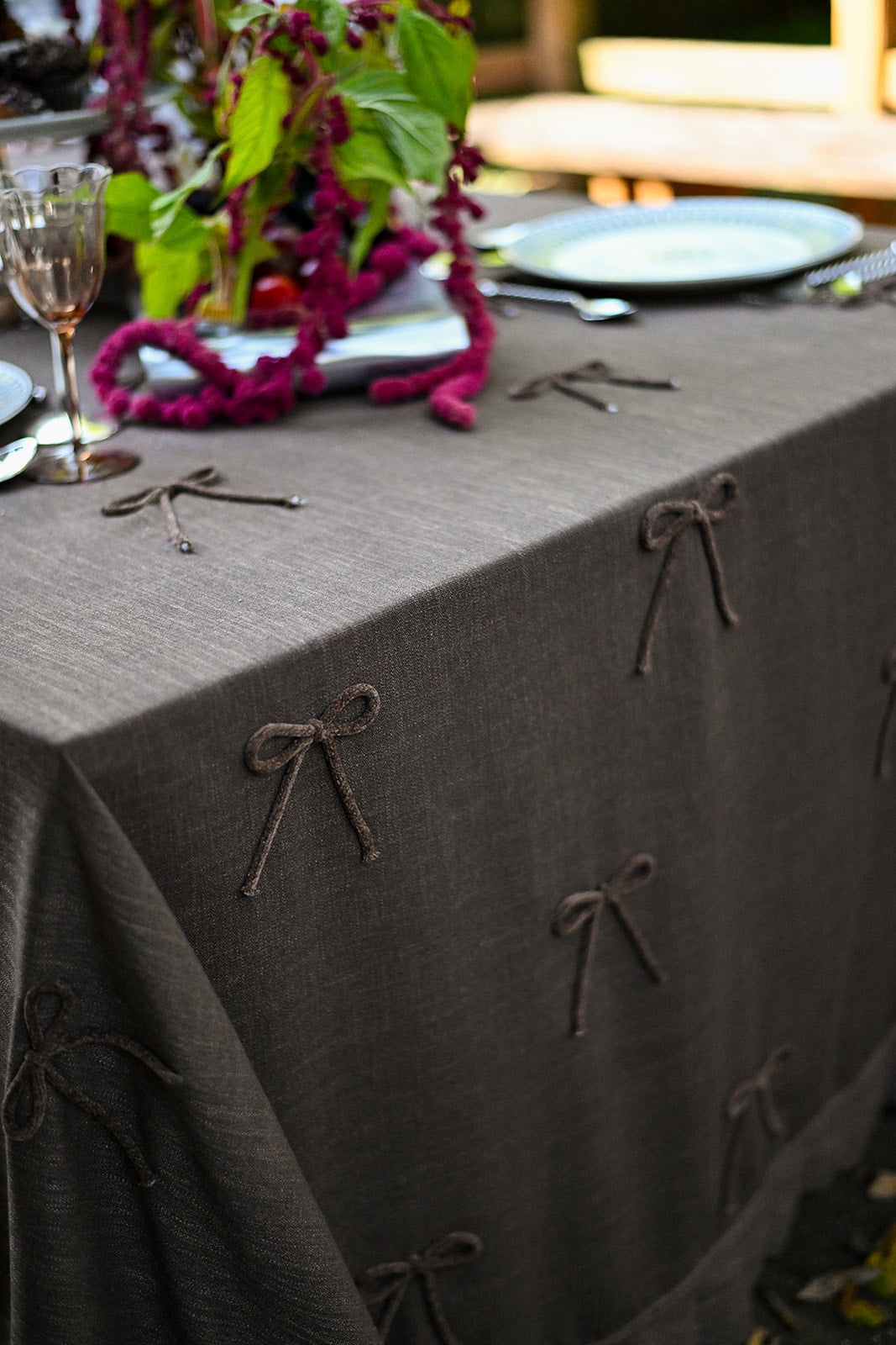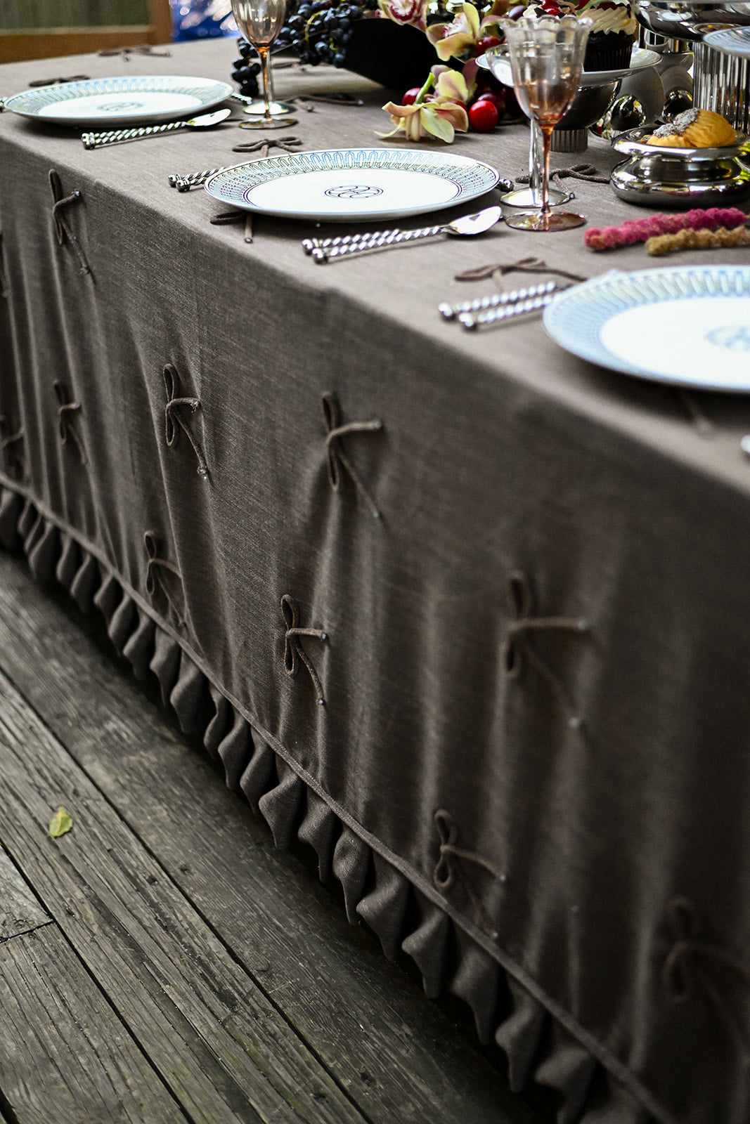 This Brown linen tablecloth is beautifully detailed with delicate bow accents scattered across the fabric, adding a touch of charm and sweetness. The design is finished with a pleated bottom edge, giving it an elegant, tailored look. Its combination of natural linen texture with sophisticated detailing makes it both timeless and unique.