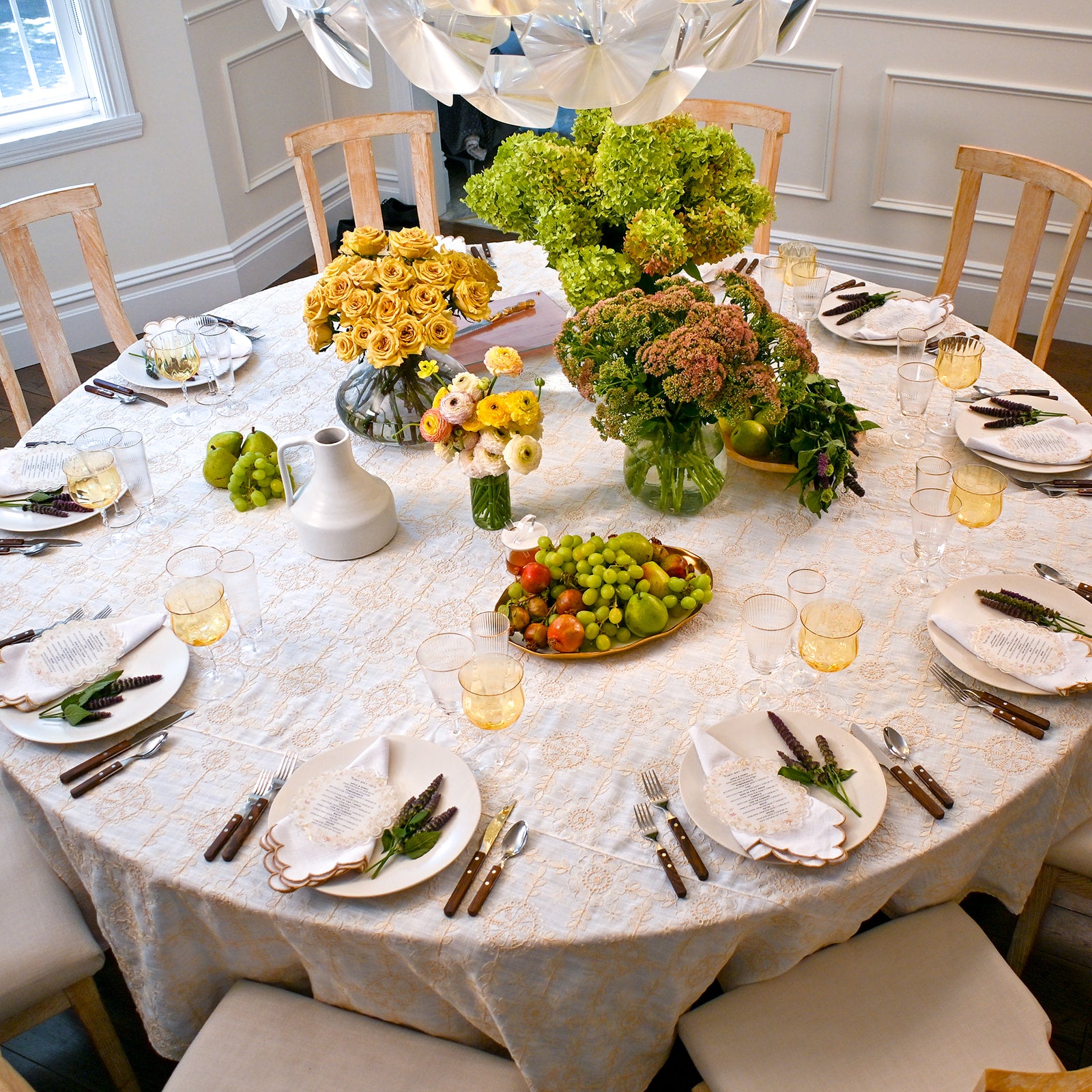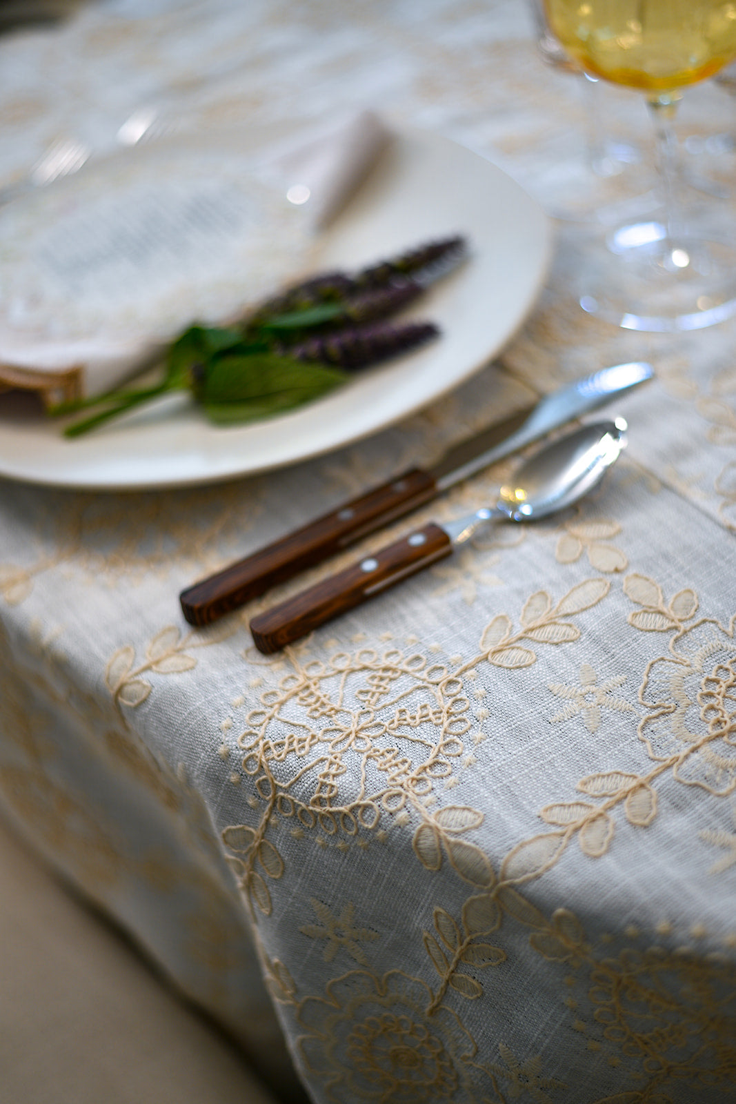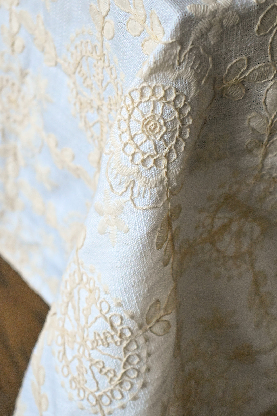 This tablecloth is a white linen fabric embroidered with golden floral motifs arranged in an elegant, repeating pattern. Its detailed craftsmanship and classic design lend it a timeless, heritage quality that brings warmth and refinement to the table.