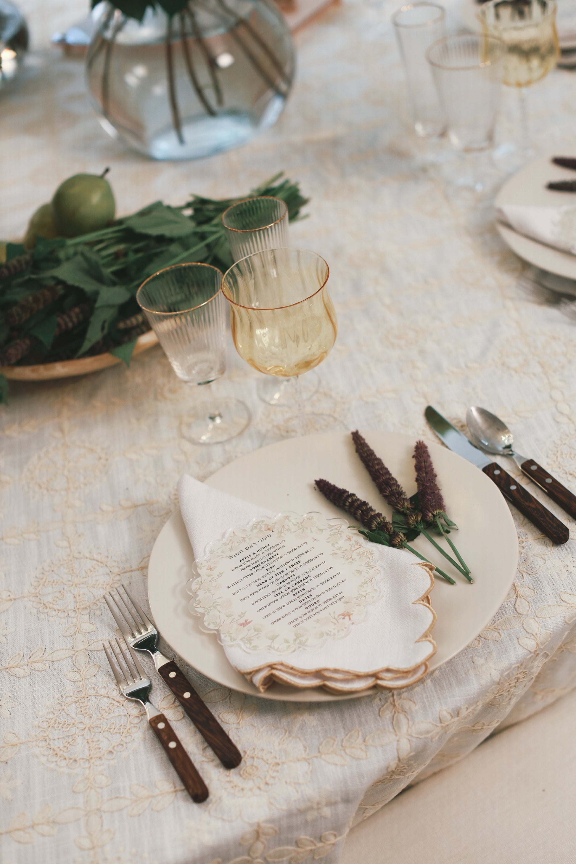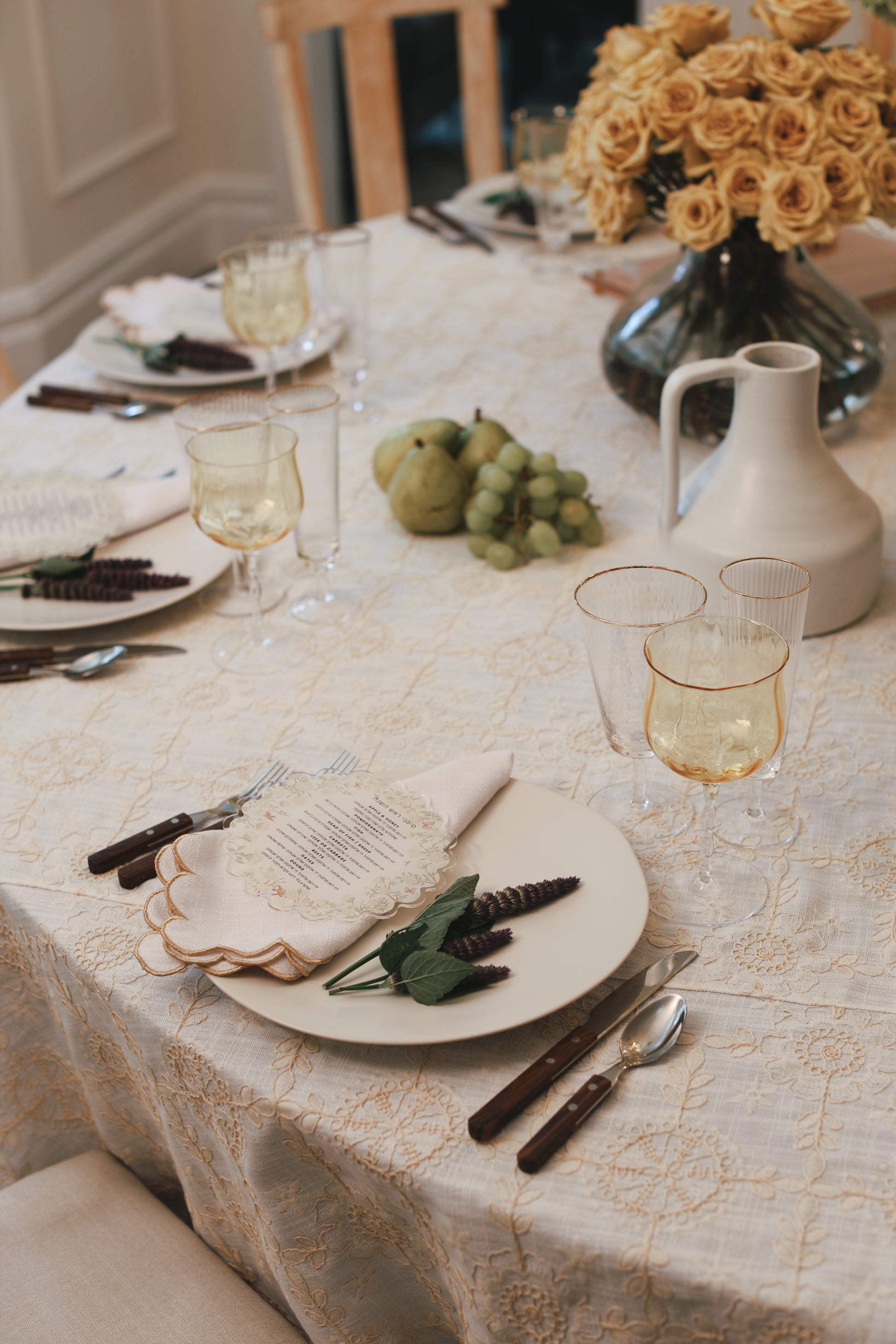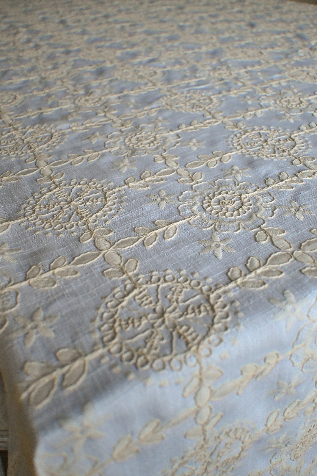 This tablecloth is a white linen fabric embroidered with golden floral motifs arranged in an elegant, repeating pattern. Its detailed craftsmanship and classic design lend it a timeless, heritage quality that brings warmth and refinement to the table.