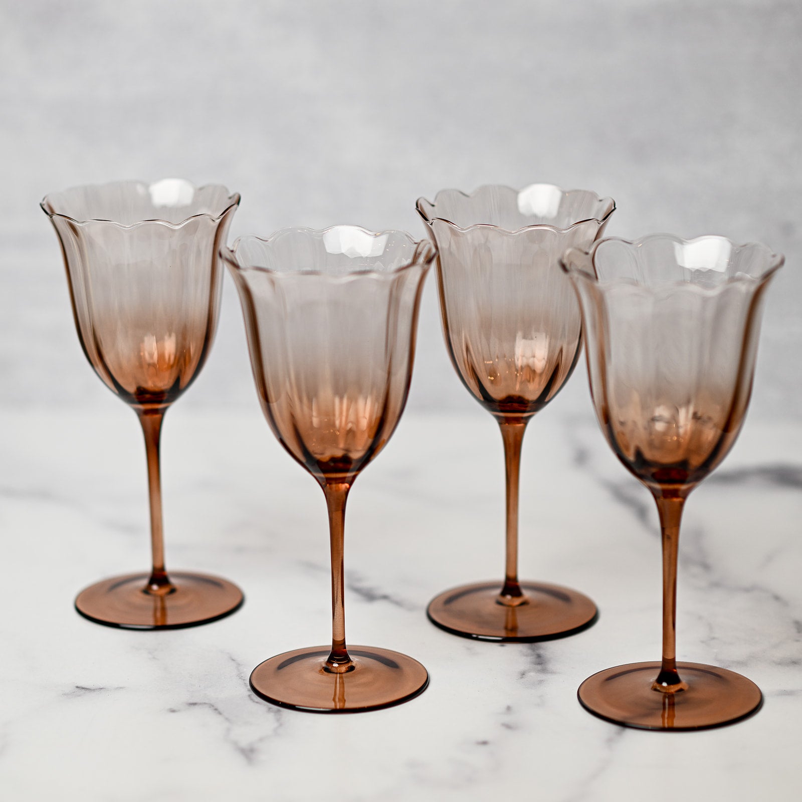 These elegant tulip-shaped glasses feature a stunning ombré finish that blends color beautifully. Made from high-quality glass, they add sophistication and charm to any table. Comes in a set of 4.