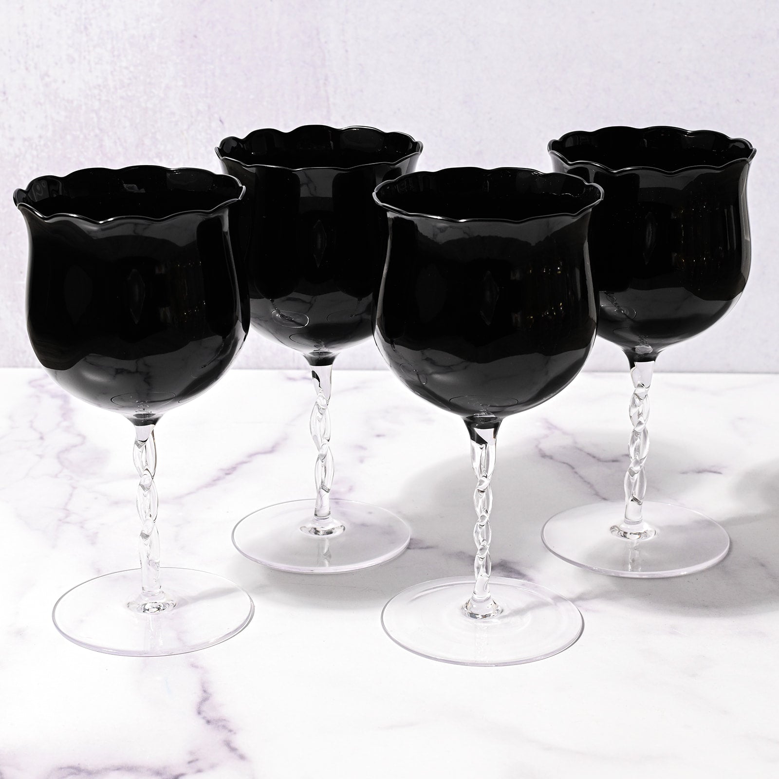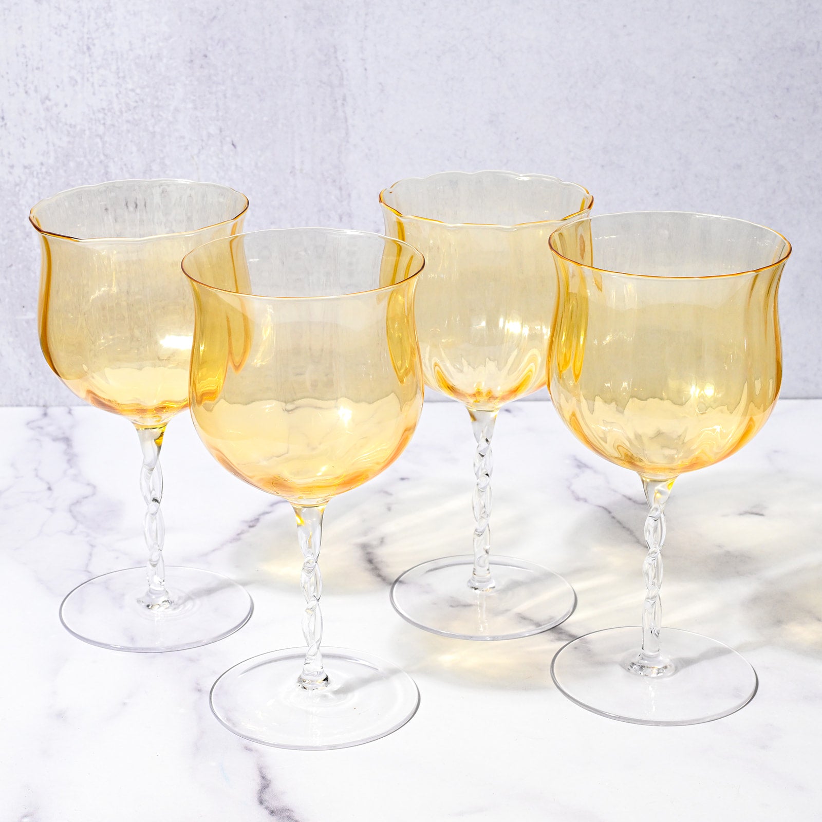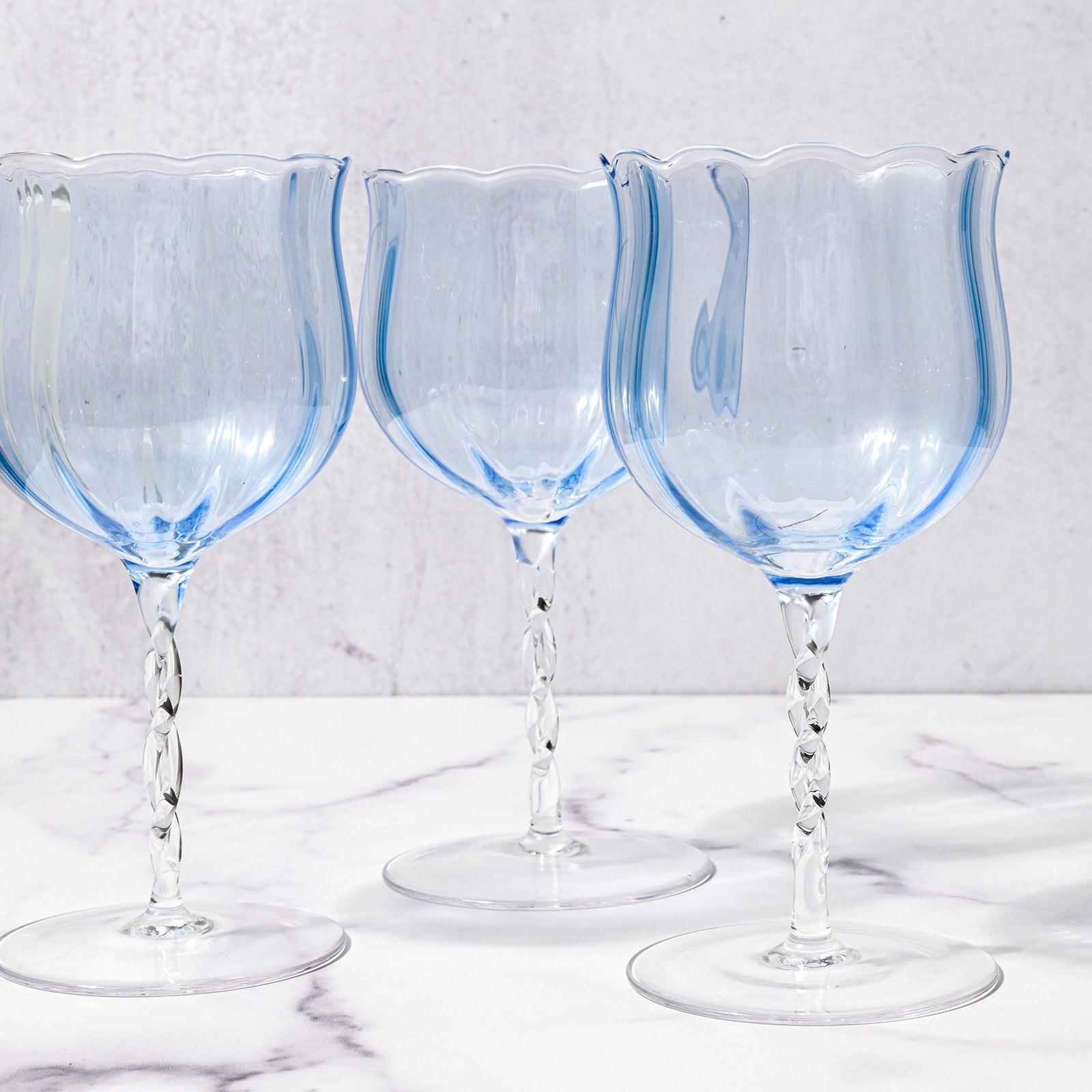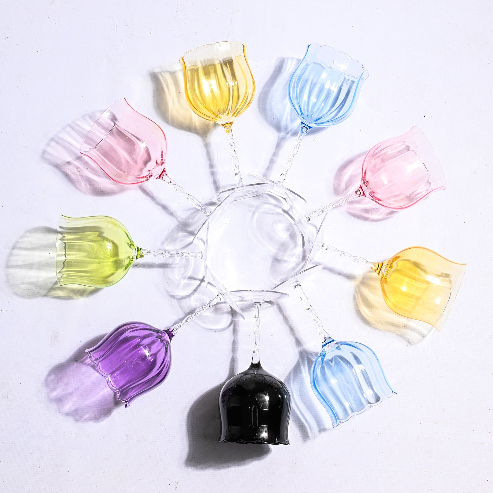These flower spiral glasses feature petal-like curves that resemble blooming tulips and twisted spiral stems that add an elegant touch. Available in a rainbow of translucent colors, they catch the light beautifully and bring a playful yet sophisticated charm to any table.