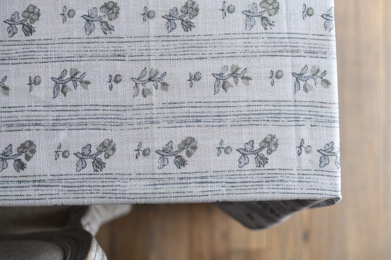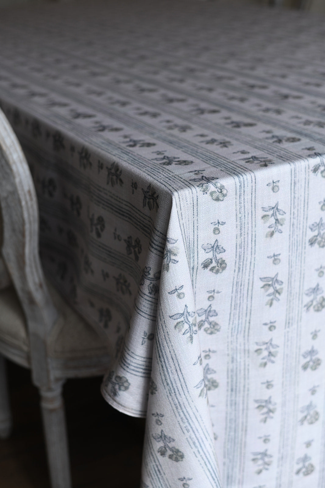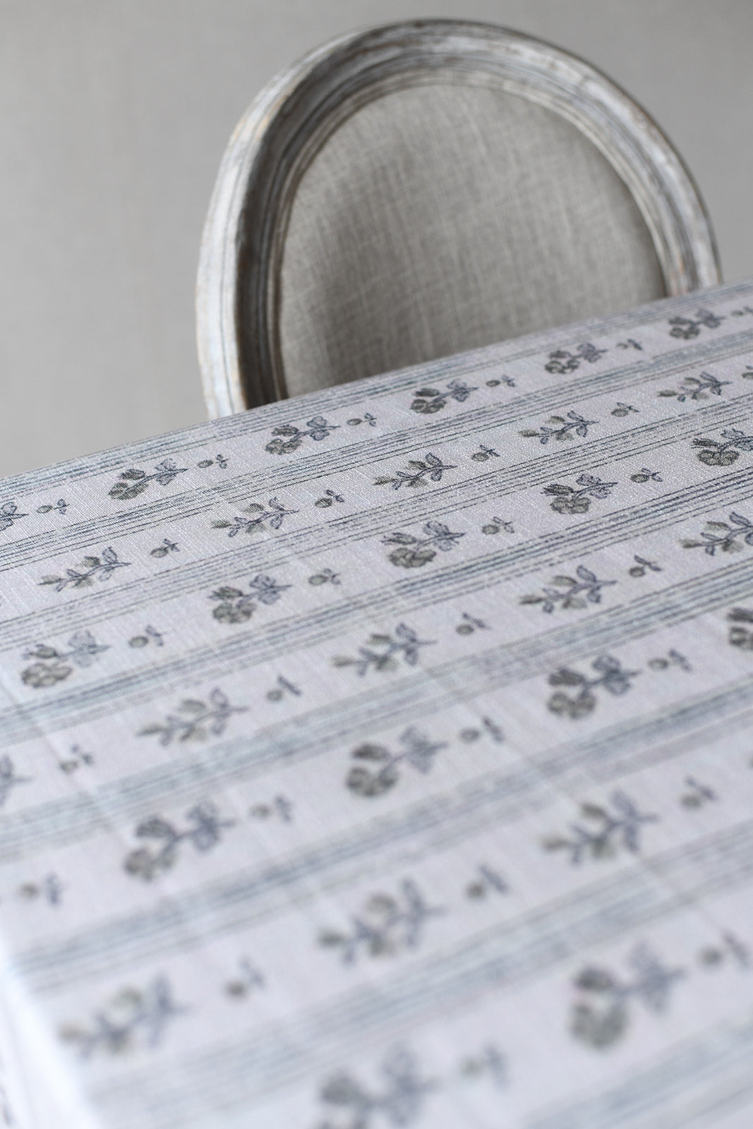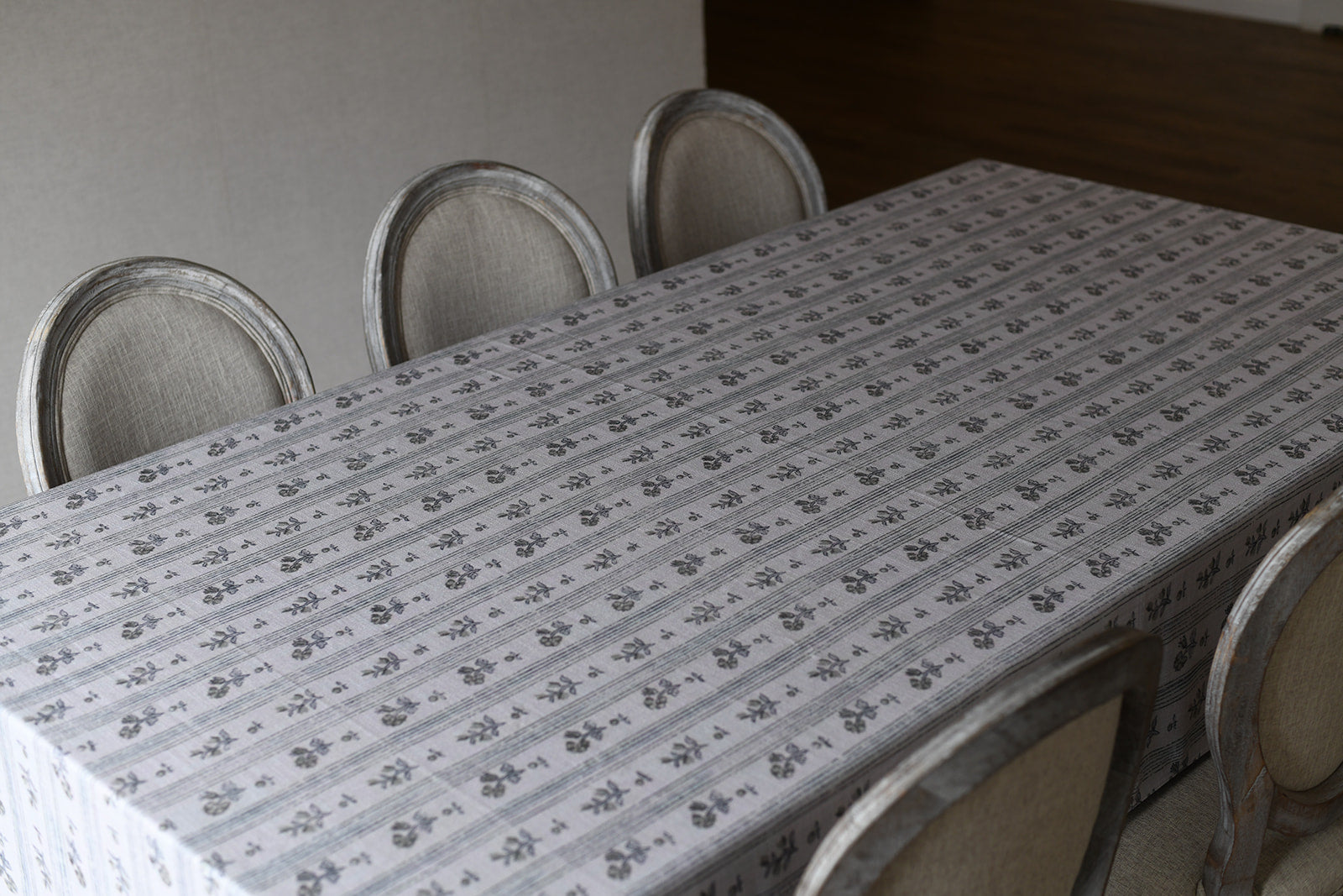 This tablecloth is a flower motif in a taupe grey on linen fabric, iron free, stain and spillproof