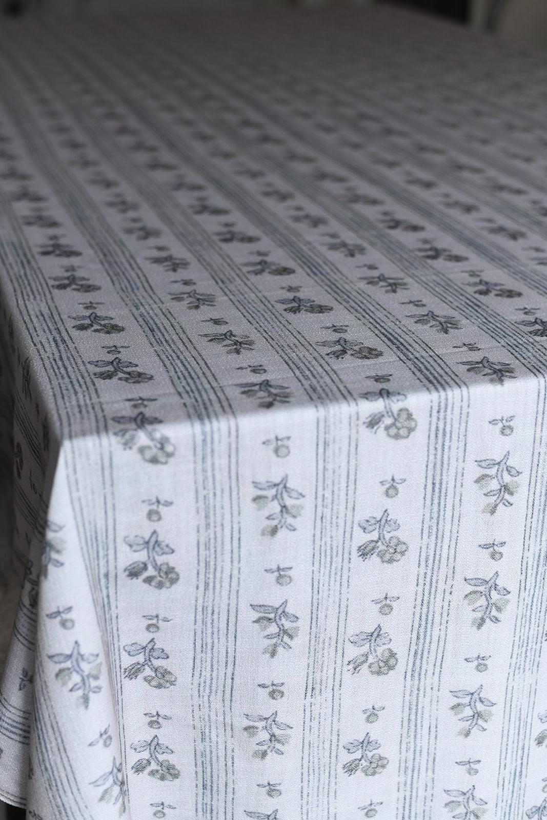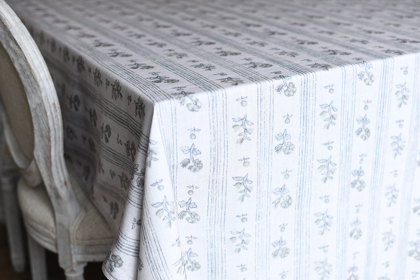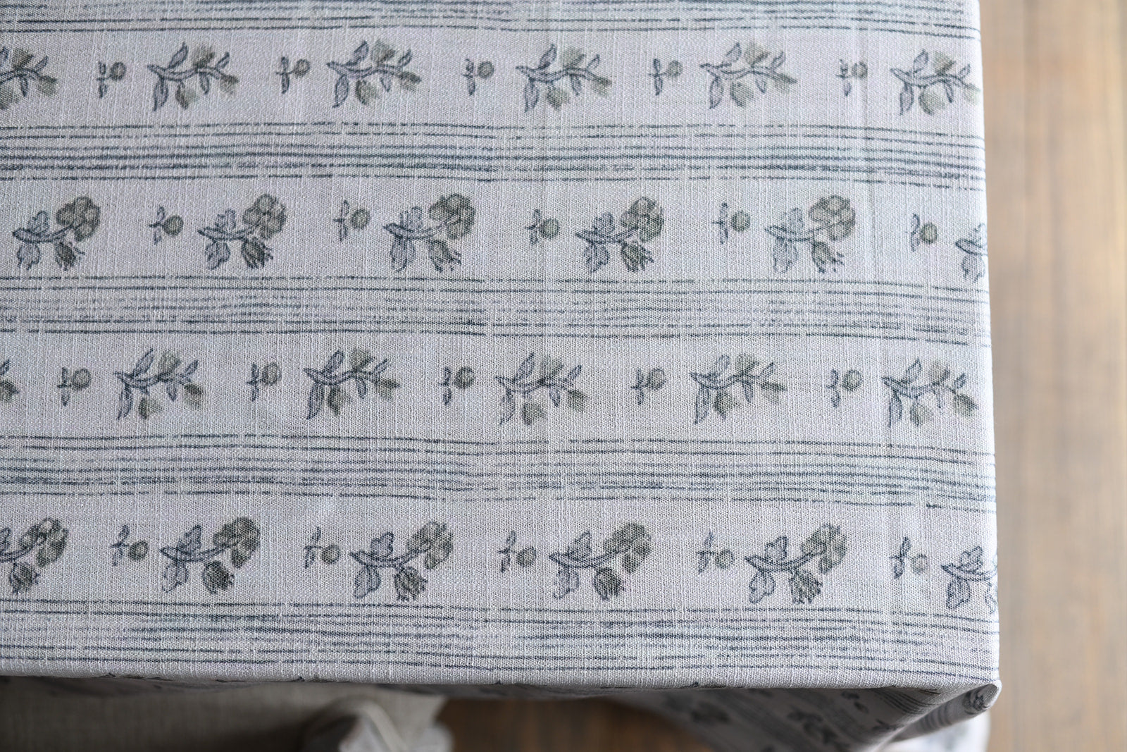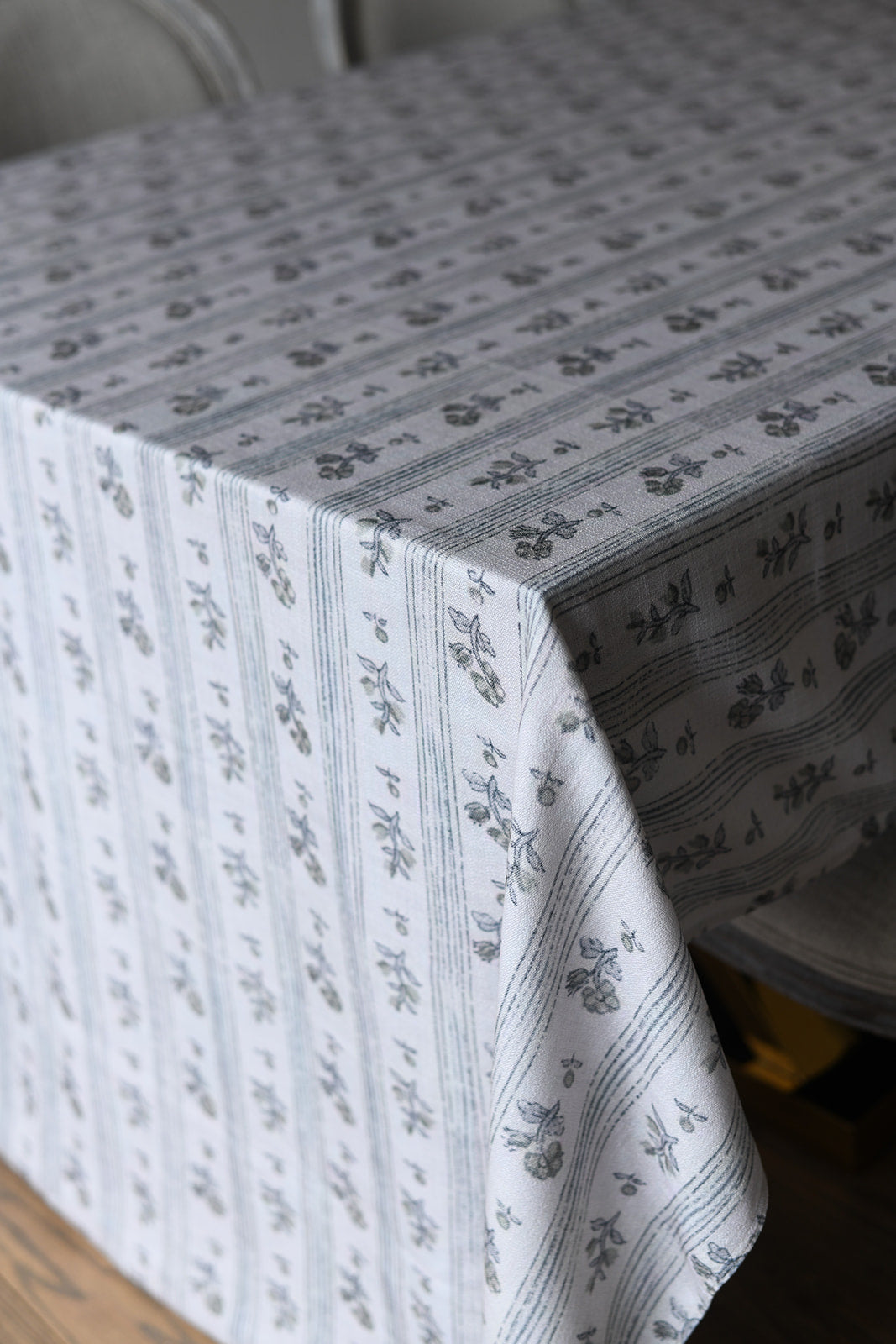 This tablecloth is a flower motif in a taupe grey on linen fabric, iron free, stain and spillproof