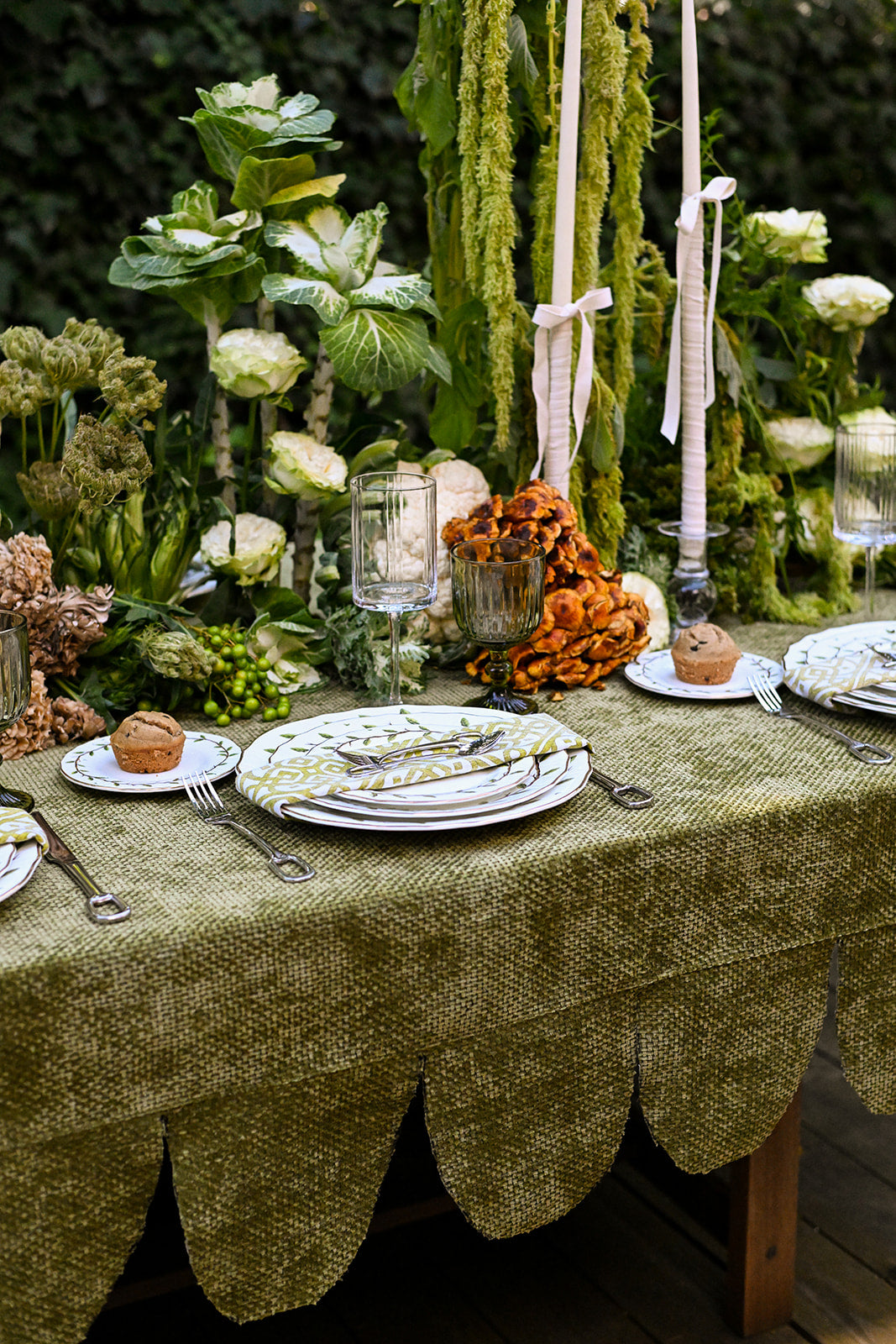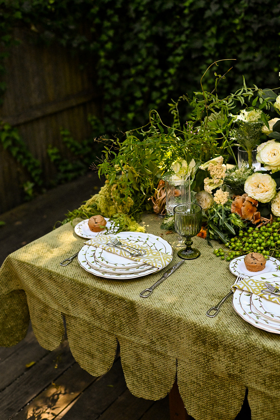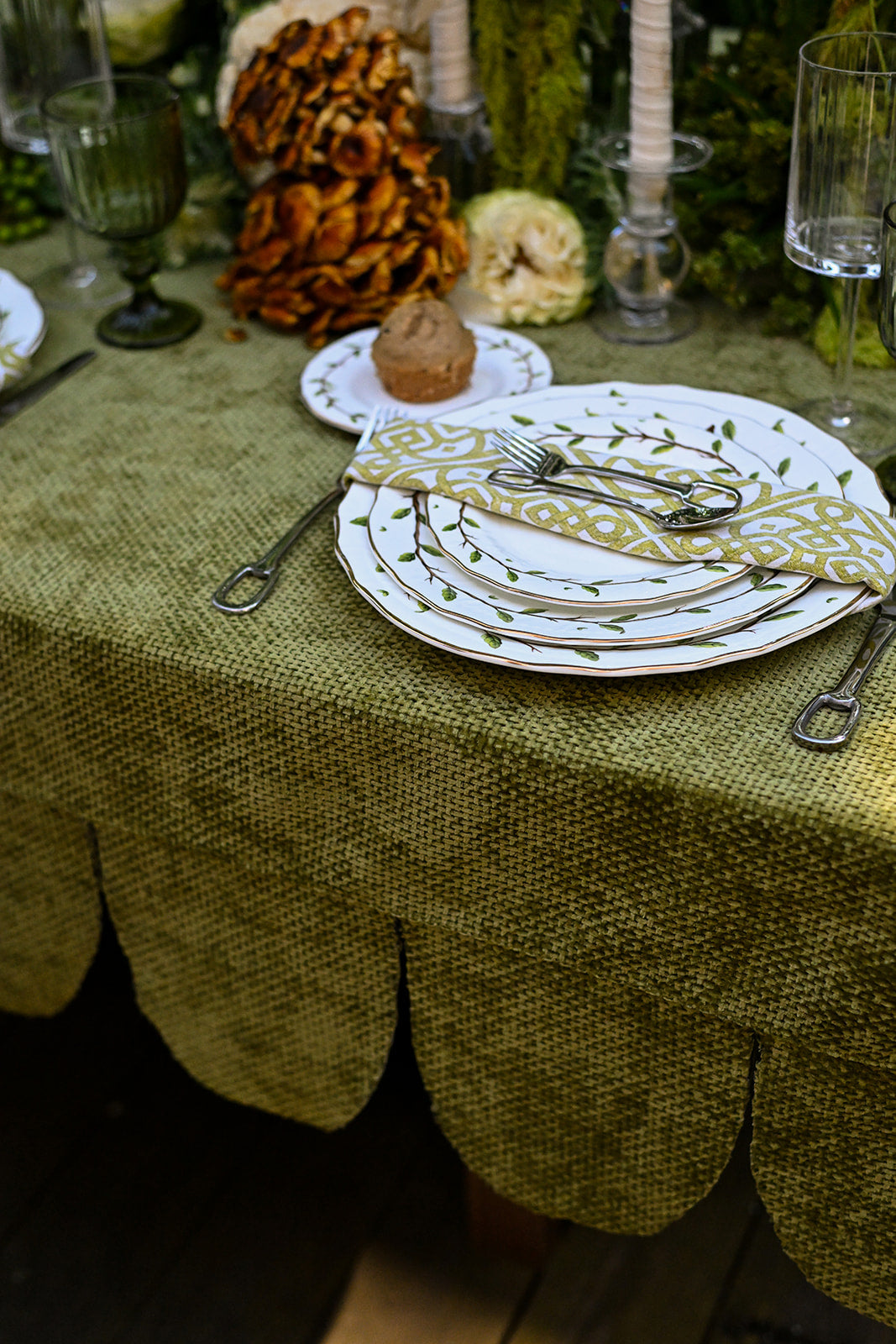 This tablecloth is crafted from a woven chenille fabric, giving it a soft yet textured feel with a subtle sheen. Its olive green tone brings a natural, earthy elegance, while the scalloped edging adds a tailored, decorative finish. Perfect for creating a refined yet inviting tablescape, it blends richness with charm.