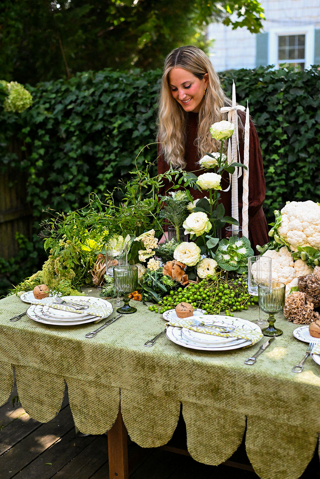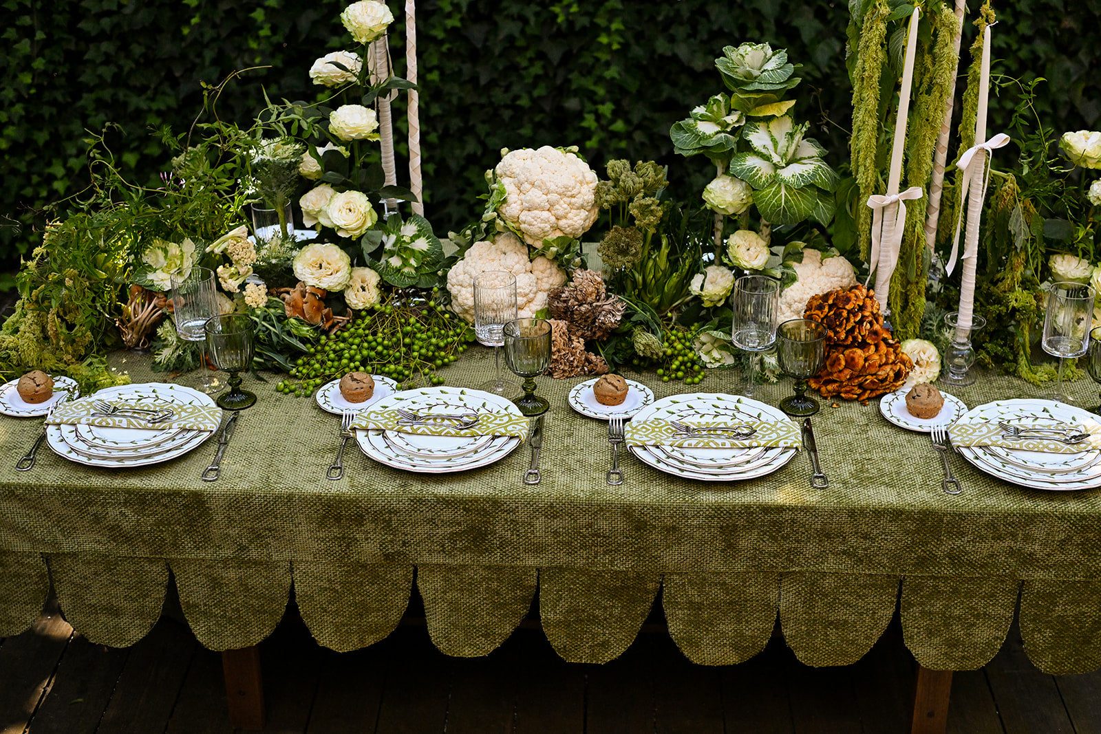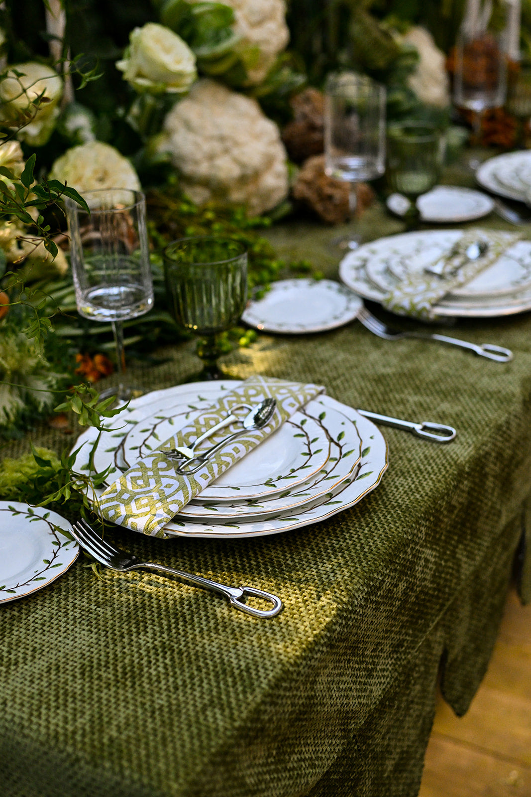 This tablecloth is crafted from a woven chenille fabric, giving it a soft yet textured feel with a subtle sheen. Its olive green tone brings a natural, earthy elegance, while the scalloped edging adds a tailored, decorative finish. Perfect for creating a refined yet inviting tablescape, it blends richness with charm.