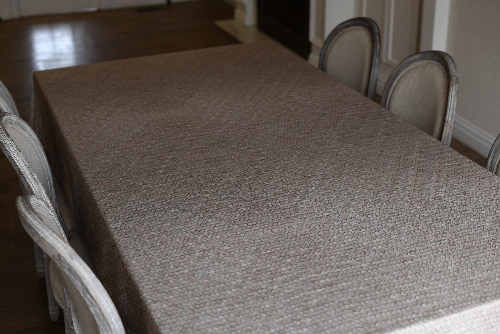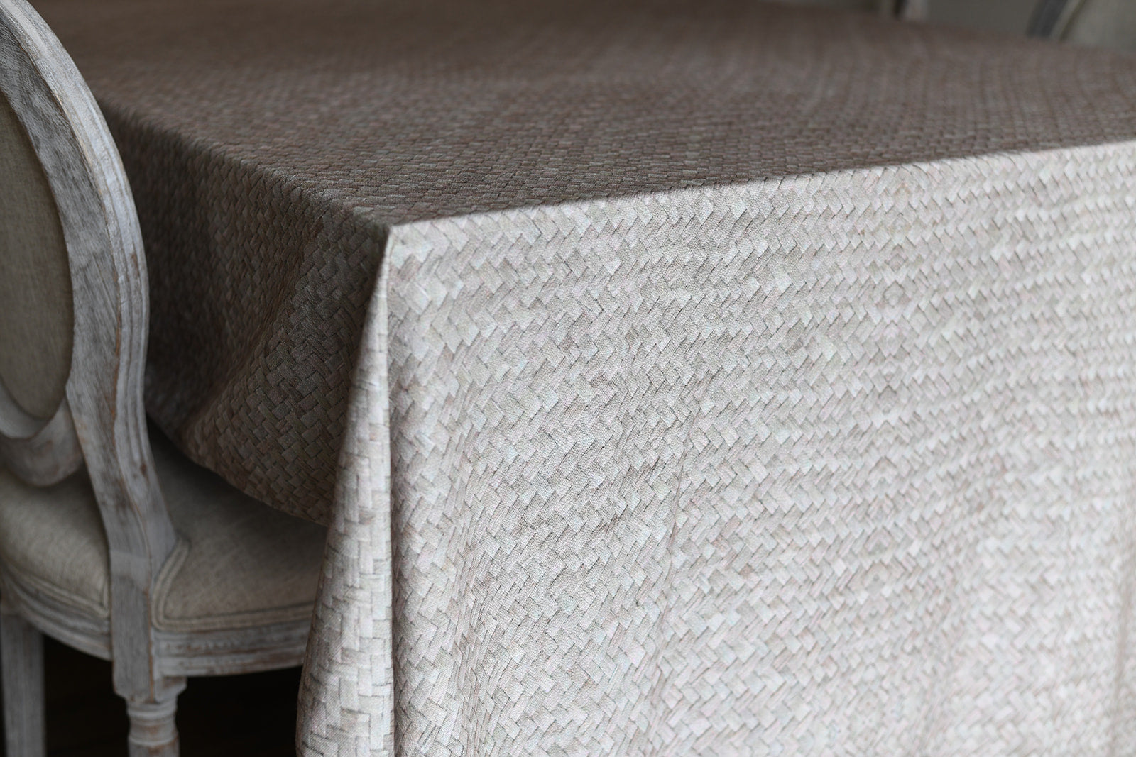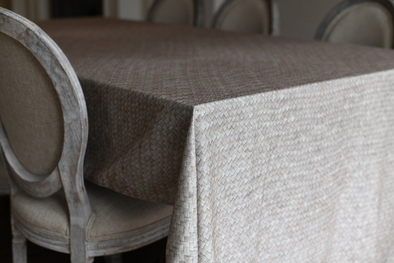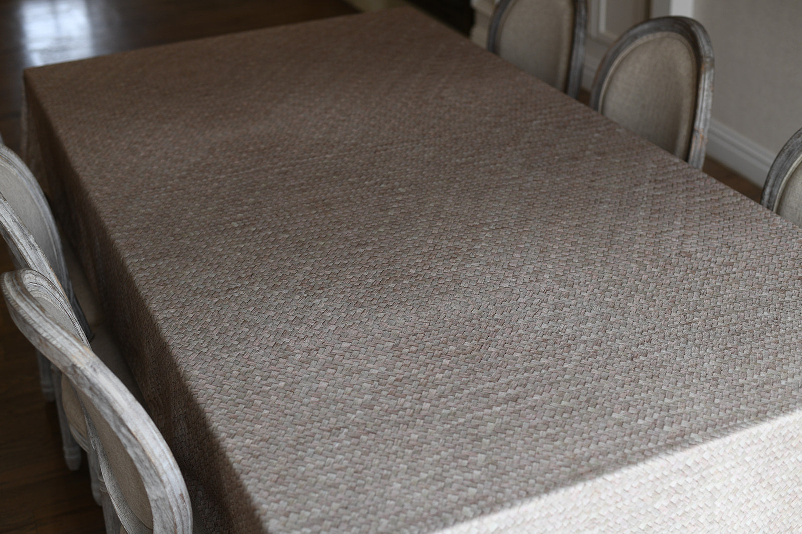 This tablecloth is a new concept of a basketweave design on linen, its gorgeous neutral colors will match everything, on our stain and spill proof material