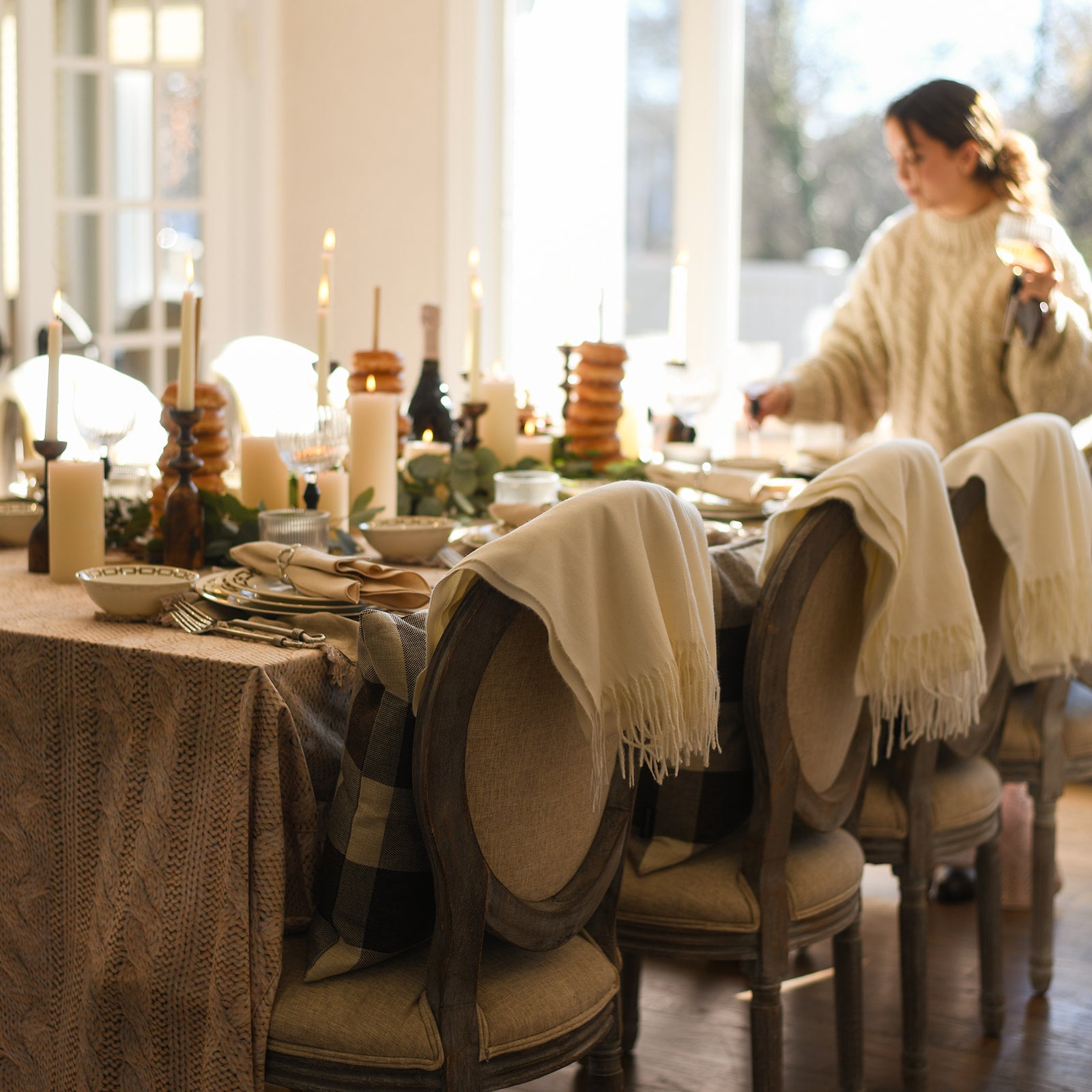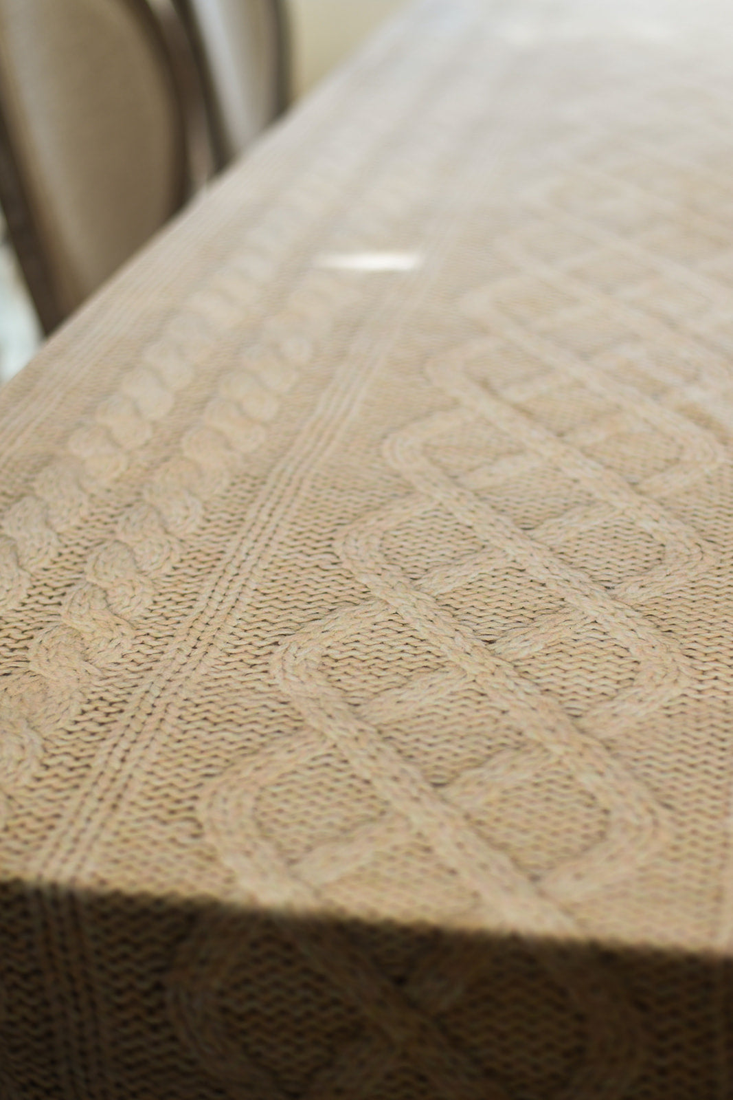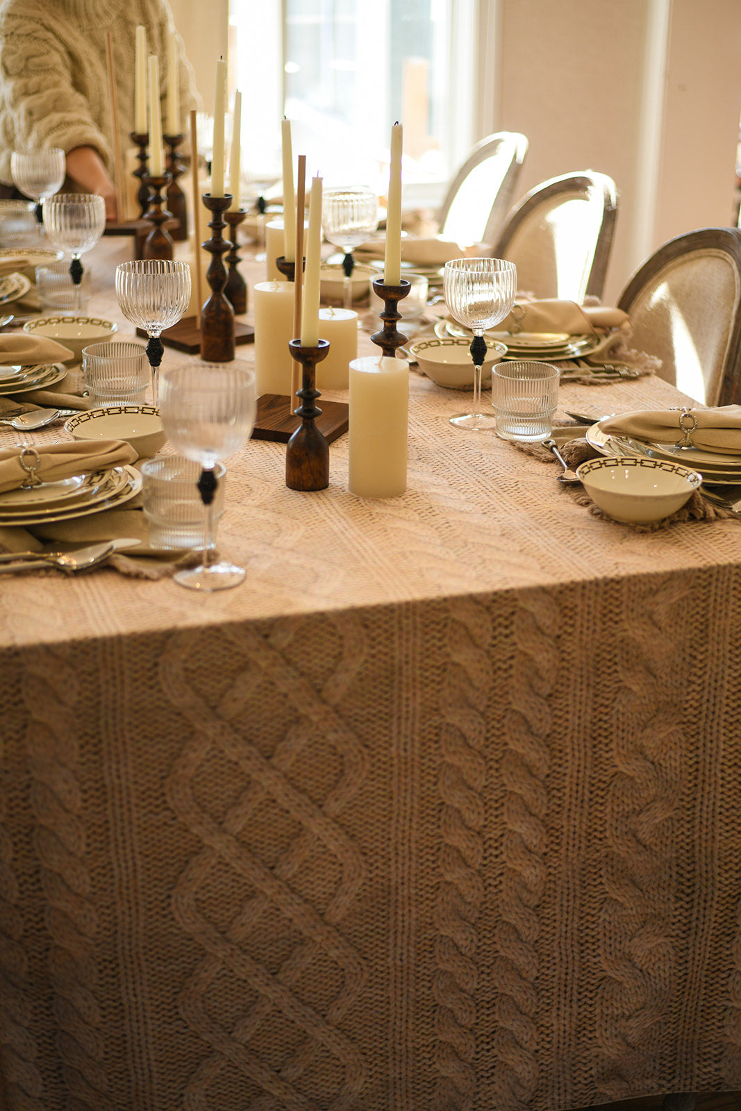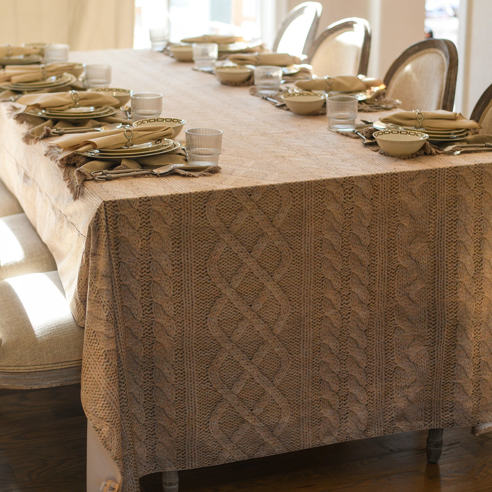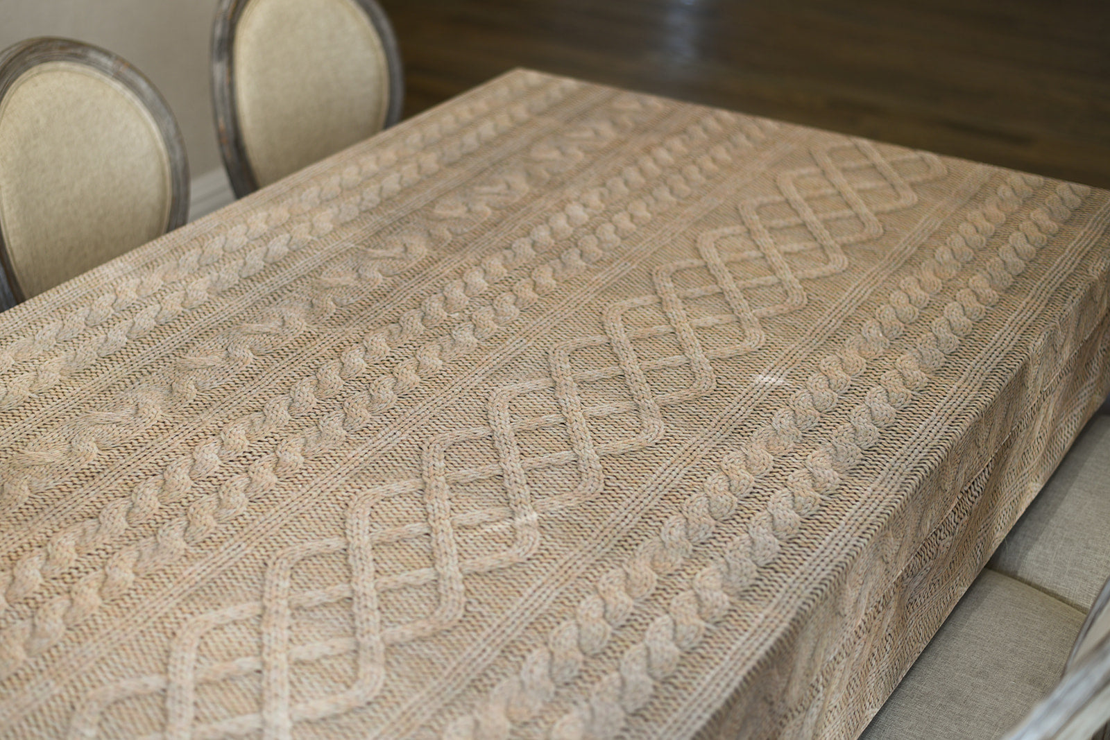 This tablecloth was inspired by Ralph Lauren and his chic and cosy aesthetic. While it looks like real cable knit it is actually a print on velvet fabric that is washable, stain proof and non iron! Elevate your home with this new collection!